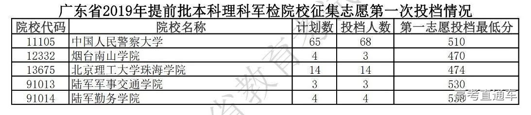 2019广东提前批本科军检院校征集志愿第一次投档情况(理科)