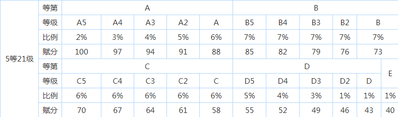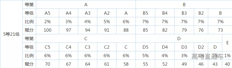 根据天津计分方式,参考每个科目的同学按照其实际得分在本省所有考生中的位次,被划分为五档21级,每一层级的考生被赋予固定的分数。各层级的具体赋分值和人数占比如上图所示。