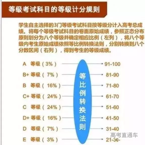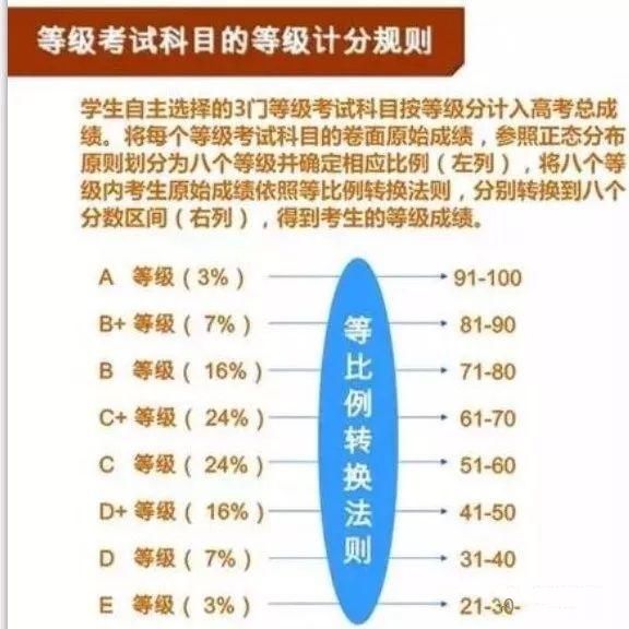 在山东,所有考生按实际成绩被划分为8个等级,各级人数占比为3%、7%、16%、24%、24%、16%、7%、3%,并依照等比例转换法则,分别转换到91-100、81-90、71-80、61-70、51-60、41-50、31-40、21-30八个分数区间,得到考生的等级成绩。