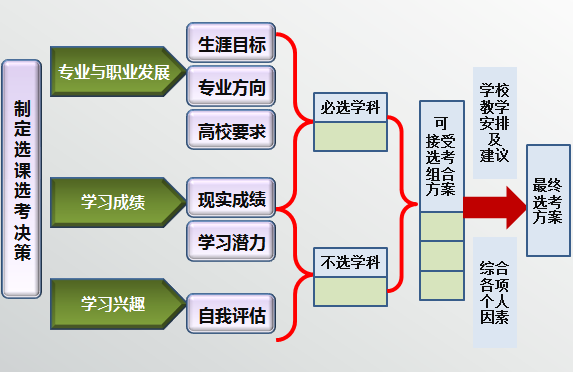 首先,我们要找到六门中在自我比较和校内排名中都具有较明显优势的1-2个学科,将之拟定为“待选学科”;之后,再分析自己是否有存在明显劣势的学科,有则将之确定为“不选学科”。此时决策的主要参考的是高一历次考试的各科成绩,以及学科老师和我们自己对六科学习适应性及潜力的评估。