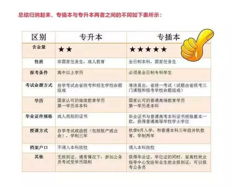【专升本与专插本的联系】 通过高职自招、学考录取提前被录取的都是大专生,与高考录取进来的考生学费、待遇相同,拿的也是全日制的专科毕业证书。 如果想要继续深造考本科,有2个选择:专升本(成教类的本科)或专插本(本科插班生-统招学历本科)。 【专升本与专插本的区别】 专插本一般是指在校的专科生,在大二开始备考“专插本”,大三的时候参加考试的升学模式,一般是插原学校的本科或者参加其他学校统一考试,然后大专毕业的时候直接进入本科院校学习两年,最后颁发的学历是普通高等教育(全日制本科文凭)。 专升本我们通常指的是自学考试升本,入学就可报名。需要通过周六日学习,每年参加考试,拿够毕业所需学分才能毕业。 区别一: 考试分数线规定 专插本:考试分两条线,省统考线和总分线,任何一条线达不到规定的分数,即使是学校招不够人也不会录取,这就是专插本考试的一个难点,本科插班生考试因有一定难度,所以不会根据学校的报考人数来划分,没有补录,没有降分录取。 专升本:考试分数只要达到及格线60分即可,若有考试科目成绩不合格可进行补考,补考次数没有限制。 区别二: 上课方式不同 专插本是全日制脱产上课,就是周一至周五上课,周末放假。专插本是本科大学三年级插班生,同班同学都是三年前的高三参加全国普通高考成功录取的同学,他们是本科大三,专插本是由大专大三变成了本科大三,并一起读到大四共同毕业,共同获得普通高等学校的含金量最高的本科大学毕业证。 专升本一般是业余上课的,比如晚上上课或周末上课。自考一般也是业余上课的。 区别三: 含金量不同 专插本:插班生修完本科计划规定的课程,准予本科毕业,发给本科毕业生证,并授予相应的学士学位。 专升本:一般取得本科学历(若想取得学士学位,必须通过全国学位英语水平考试并所考科目必须达75分以上)。 区别四: 考试时间不同 专插本考试时间:专插本1年考一次,一月报考,三月考试,四月出成绩 四~五月录取,八九月入学。 专升本考试时间:升本是一年考3次,分别是1月、4月和10月考试,但是80%的科目是在4月和10月考,15%的科目在1月考,一年考2-3次试,每次有1-4科考试。
