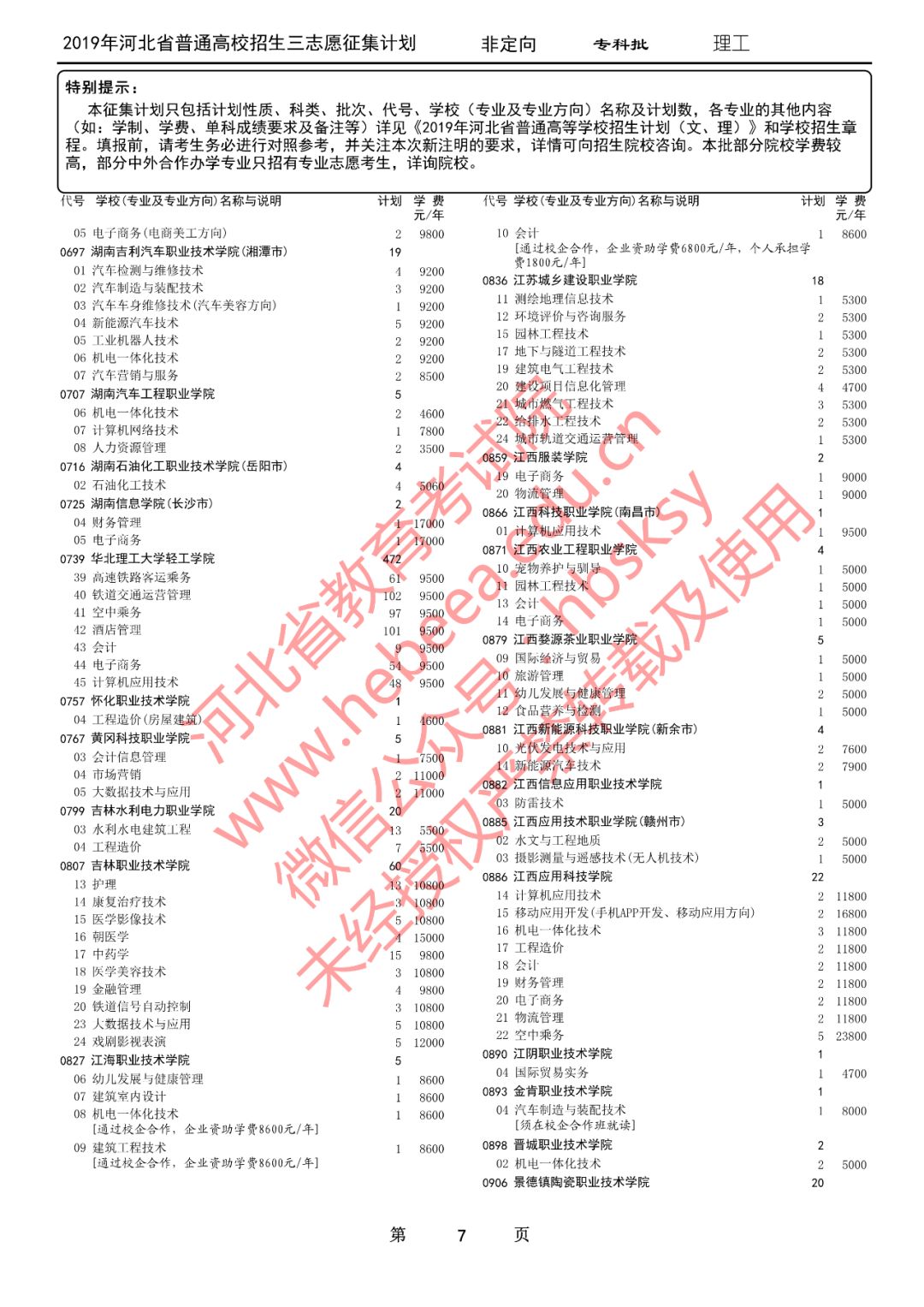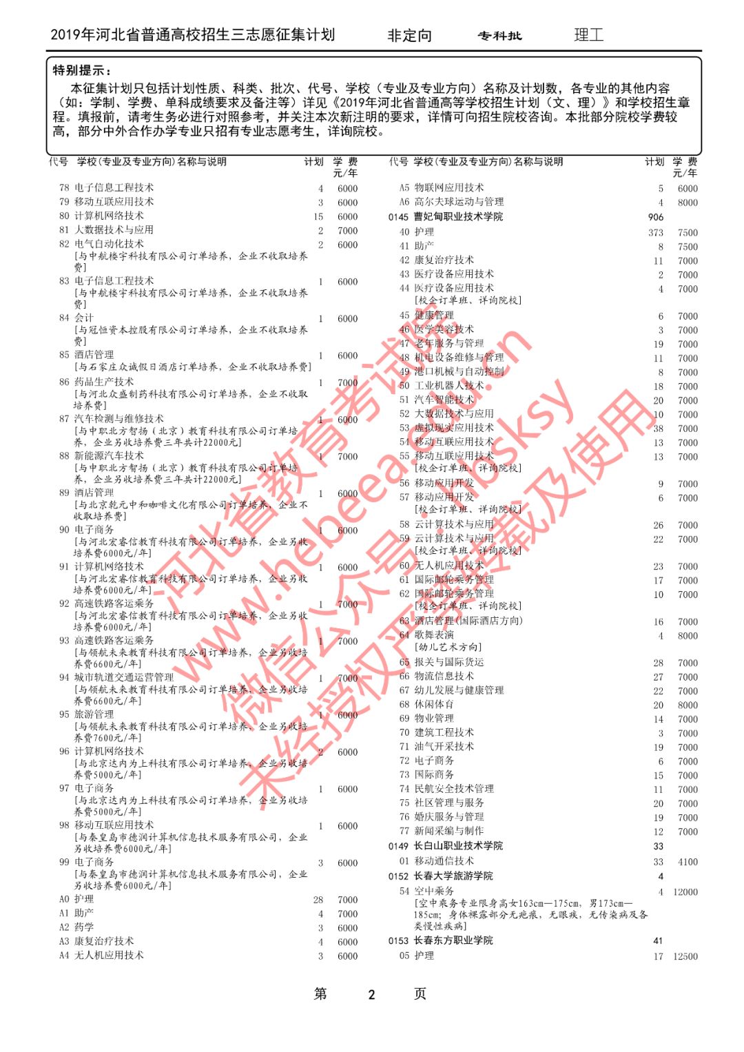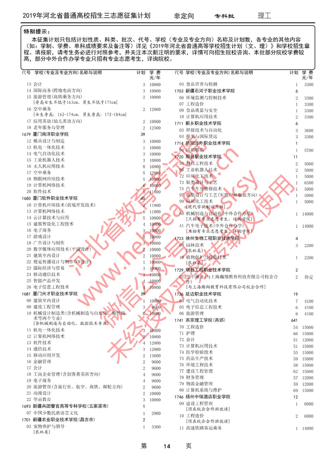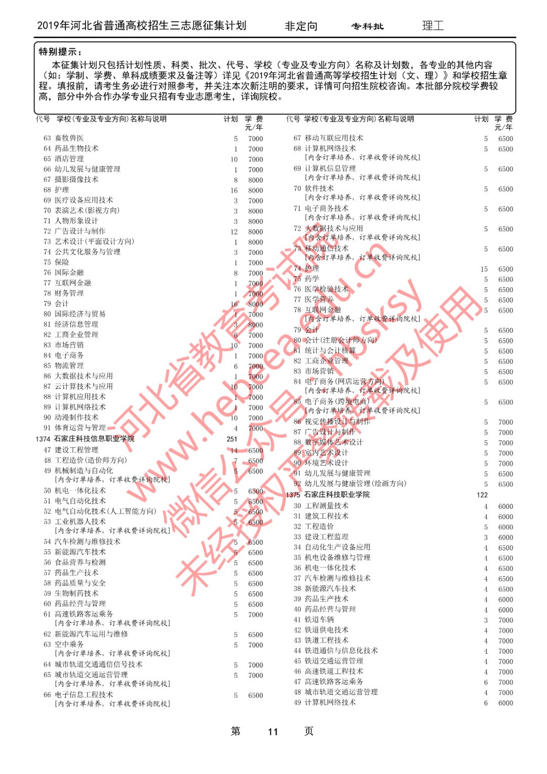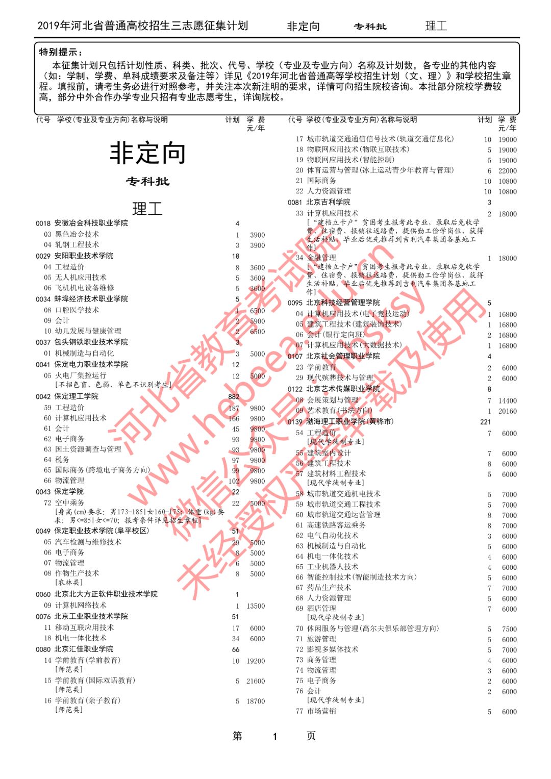 特别提醒:本征集计划只包括计划性质、科类、批次、代号、学校(专业及专业方向)名称及计划数,各专业的其他内容(如:学制、学费、单科成绩要求及备注等)详见《2019年河北省普通高等学校招生计划(文、理)》和学校招生章程。填报前,请考生务必进行对照参考,并关注本次新注明的要求,详情可向招生院校咨询。