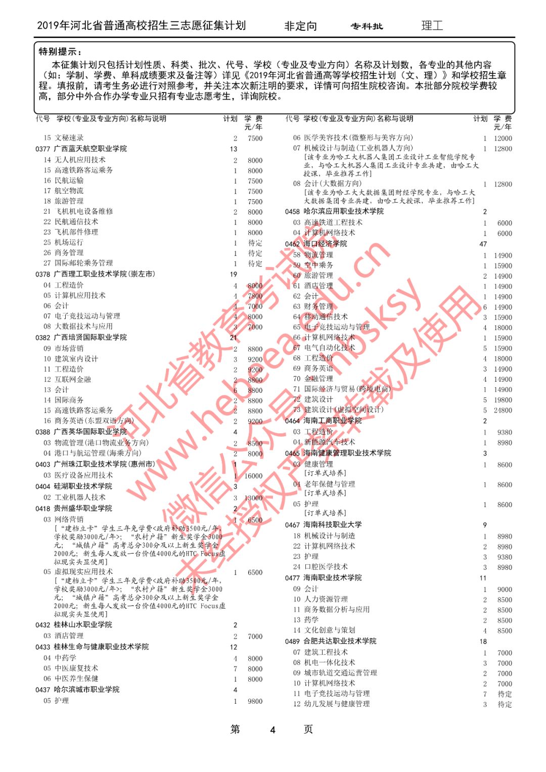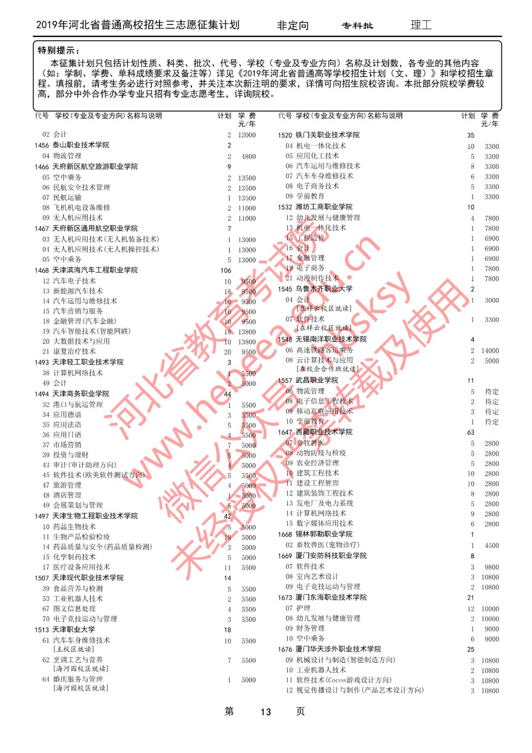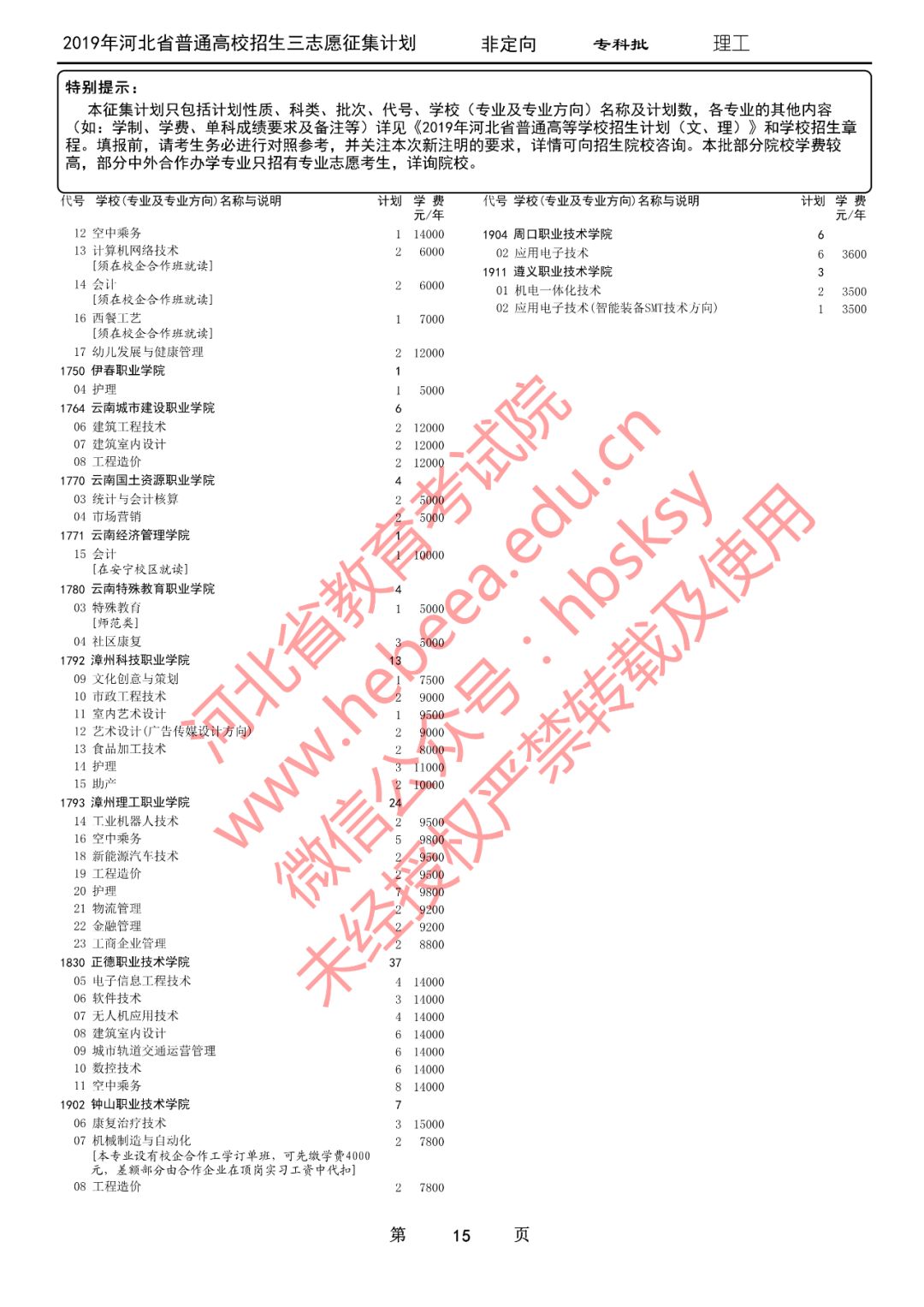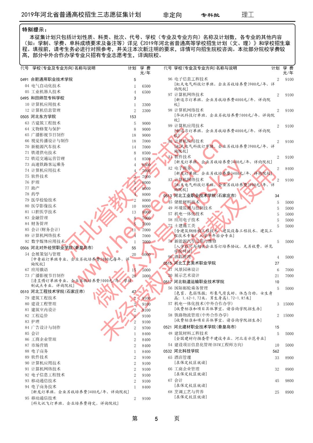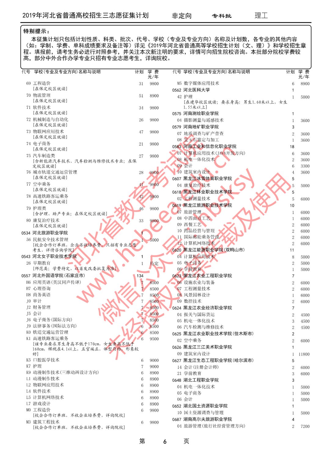 特别提醒:本征集计划只包括计划性质、科类、批次、代号、学校(专业及专业方向)名称及计划数,各专业的其他内容(如:学制、学费、单科成绩要求及备注等)详见《2019年河北省普通高等学校招生计划(文、理)》和学校招生章程。填报前,请考生务必进行对照参考,并关注本次新注明的要求,详情可向招生院校咨询。