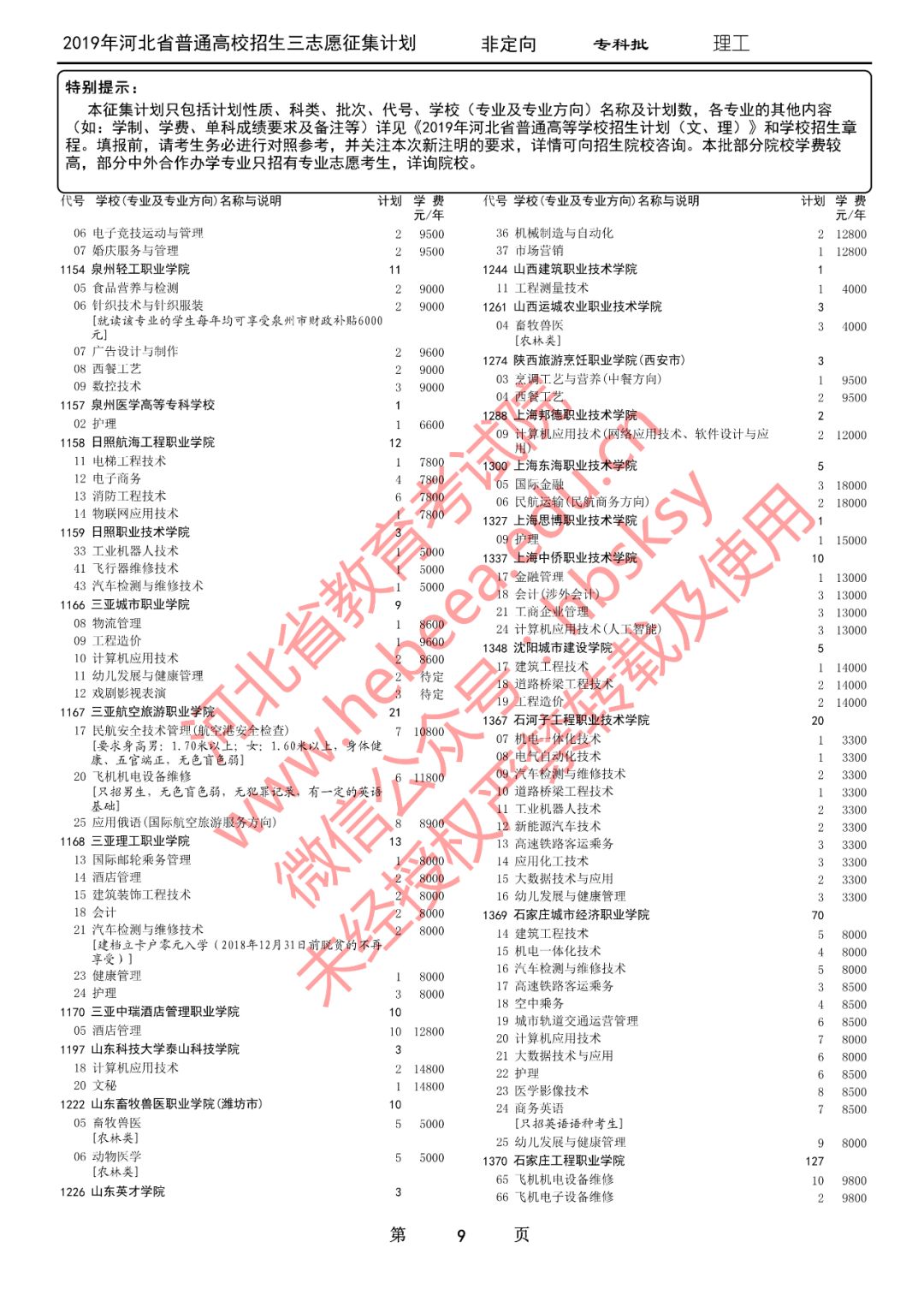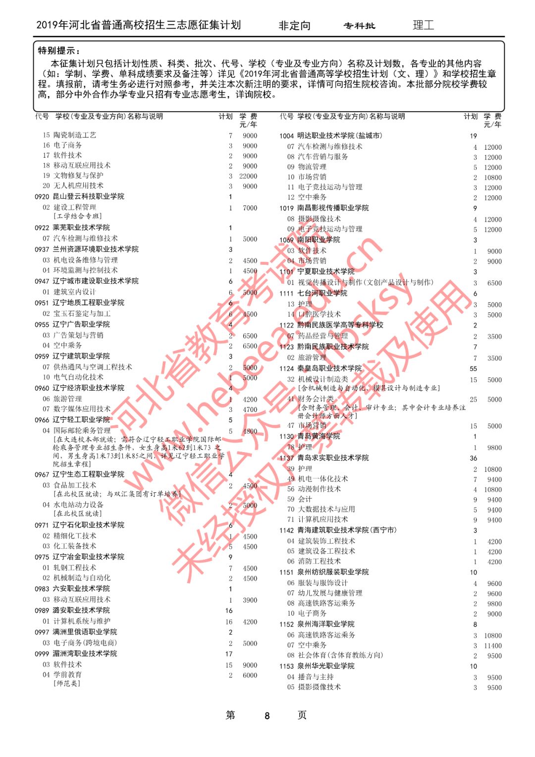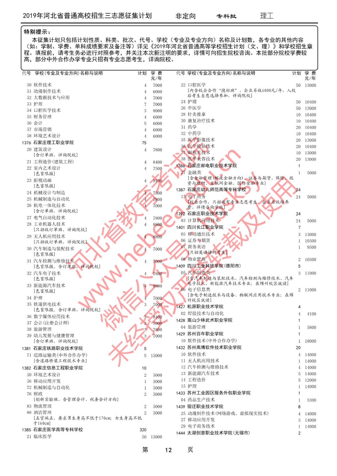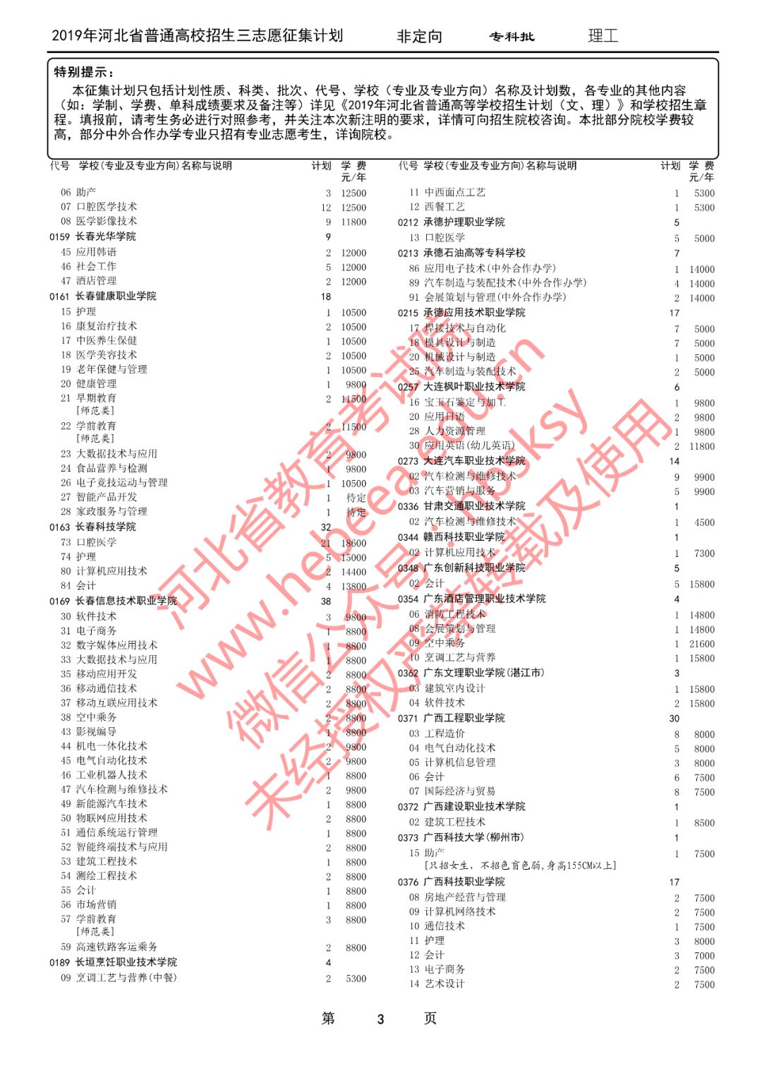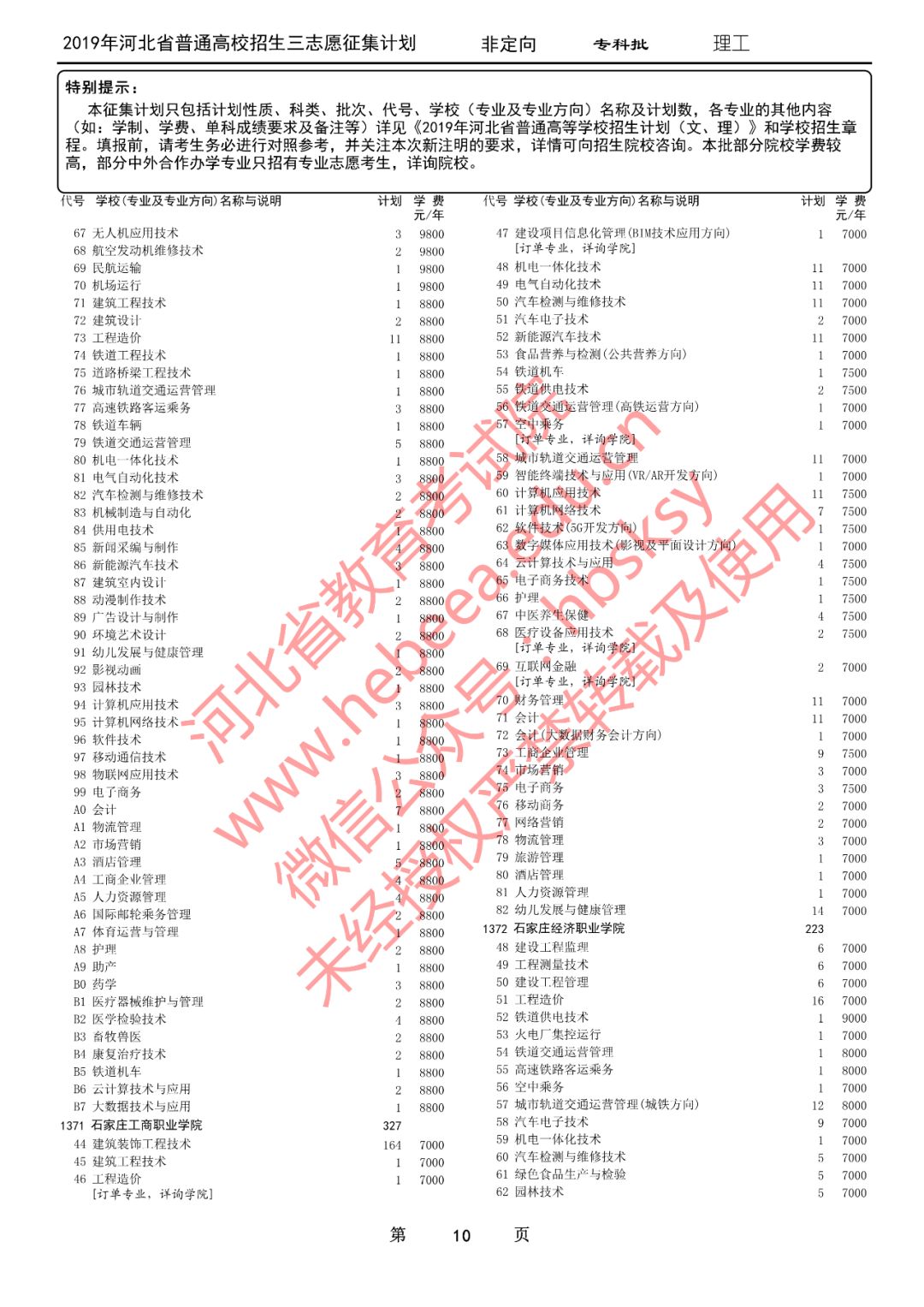 特别提醒:本征集计划只包括计划性质、科类、批次、代号、学校(专业及专业方向)名称及计划数,各专业的其他内容(如:学制、学费、单科成绩要求及备注等)详见《2019年河北省普通高等学校招生计划(文、理)》和学校招生章程。填报前,请考生务必进行对照参考,并关注本次新注明的要求,详情可向招生院校咨询。