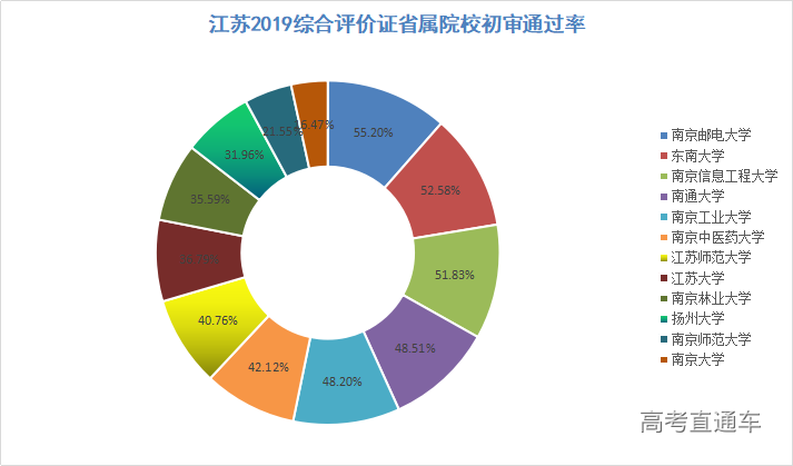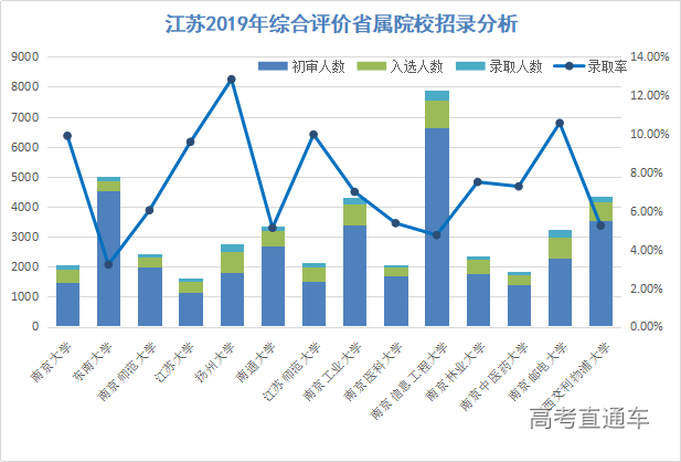 3、考试相对激烈,通过率普遍在20%左右。2019年统计江苏考生对14所大学综合评价的初审人数为35834人,通过初审和学校考核,入选了7252人,入选率20.2%。最终录取2344人,录取率为6.54%。