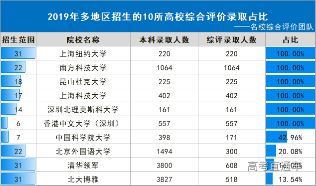 2、其他院校综合评价占比平均也在20%左右。如有:国科大2019年本科新生398人,有171人通过综合评价录取,占比42.96%,北外1494名本科新生中300人通过综合评价录取,占比20.08%,2校占比超过20%。清北综合评价录取占比16%、13.54%,但这个数据如果去掉港澳台和海外考生,基本也都在20%以上。