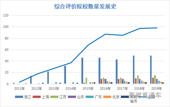 为适应新高考改革,2014年复旦、上交、国科大等7所高水平大学率先对浙江进行招生,2015年针对浙江、上海地区综合评价实施院校进步上升;2016年江苏、山东、广东地区高校加入综合评价招生行业,但大部分仅针对本省招生。