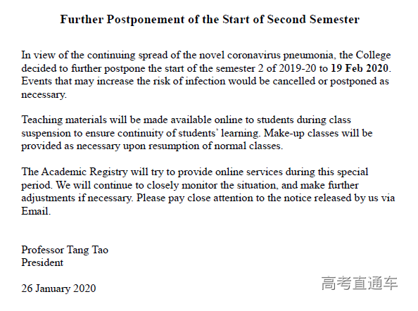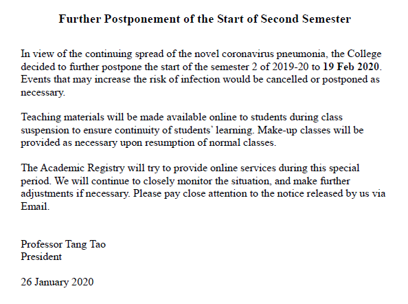 受新型肺炎疫情影响,学校决定再次延迟开学时间,新学期将延至2月19日开始,更多详情请关注教务处(AR)的电邮,教职员返校时间也相应调整至2月17日,请留意人力资源处(HRO)的电邮。