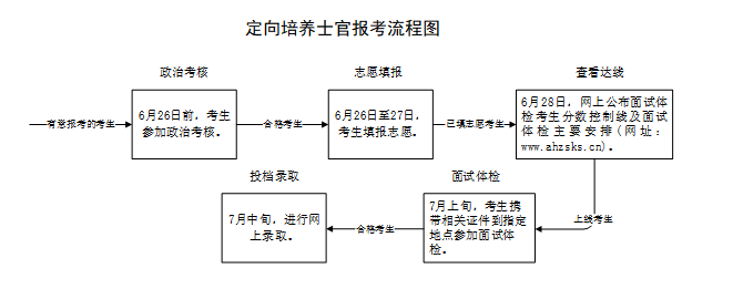 第五步,网上录取。省教育招生考试院从政治考核、体检和面试合格考生中,依据考生填报志愿和高考成绩,按照定向招生院校计划数100%投档。7月中旬,安徽招生考试网提供录取结果查询。