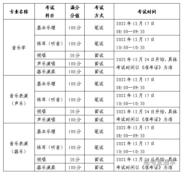 视唱科目满分为30分,其他科目满分为100分。考生所得各科成绩按以下公式折算后生成音乐学类各专业的专业课省级统考成绩(每科成绩折算后小数部分按四舍五入记分)。