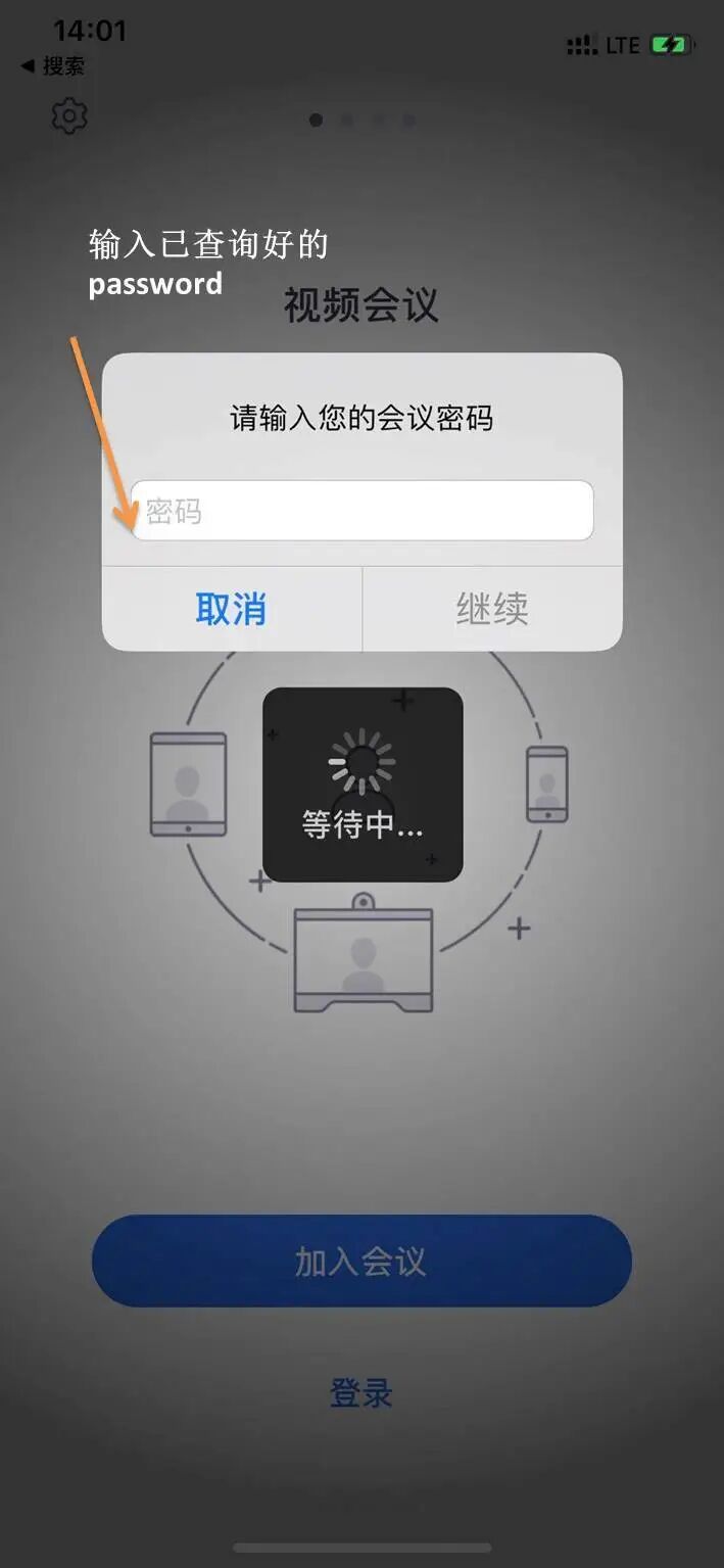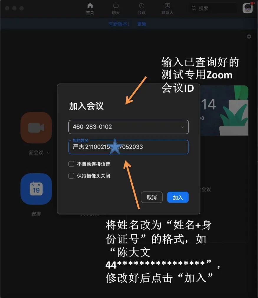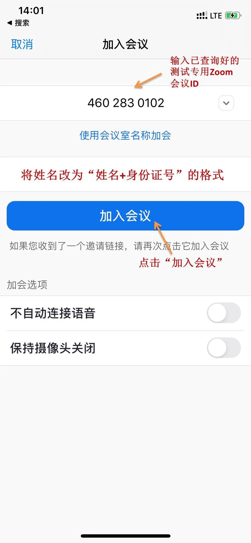 *输入提前查询好的测试专用Zoom会议ID,注意将Zoom的姓名改为“姓名+身份证号”的格式,如“陈大文44****************”。