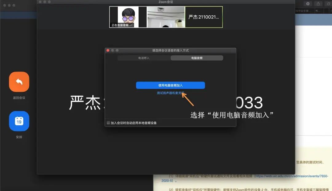*选择“使用电脑音频加入”,以便考生和辅导老师沟通。同时点击“开启视频”。