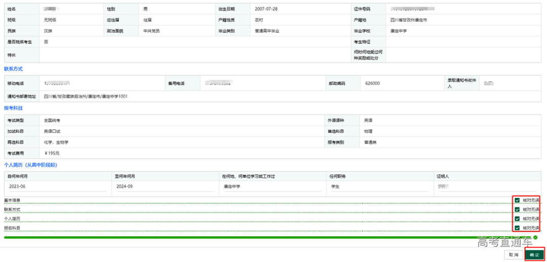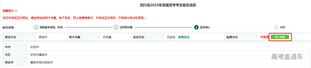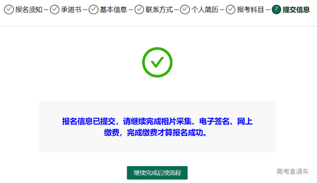 至此,考生网上报名流程完毕,考生填报的报名信息不能再做修改。如个人报考信息填报错误,应主动联系县级招考机构,并按要求提交书面申请。