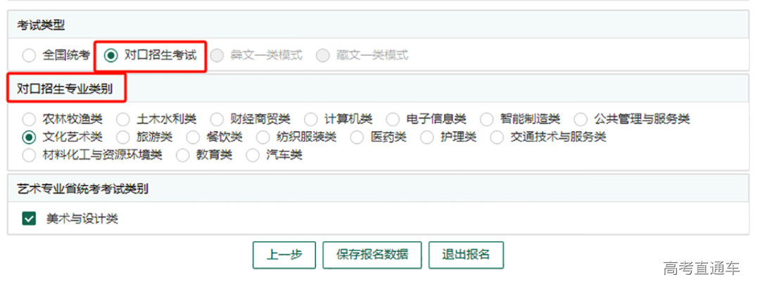 (3)报考对口招生考试的考生,需选择对口招生考试专业类别,选择“文化艺术类”的考生还需选择“艺术专业省统考考试类别”。