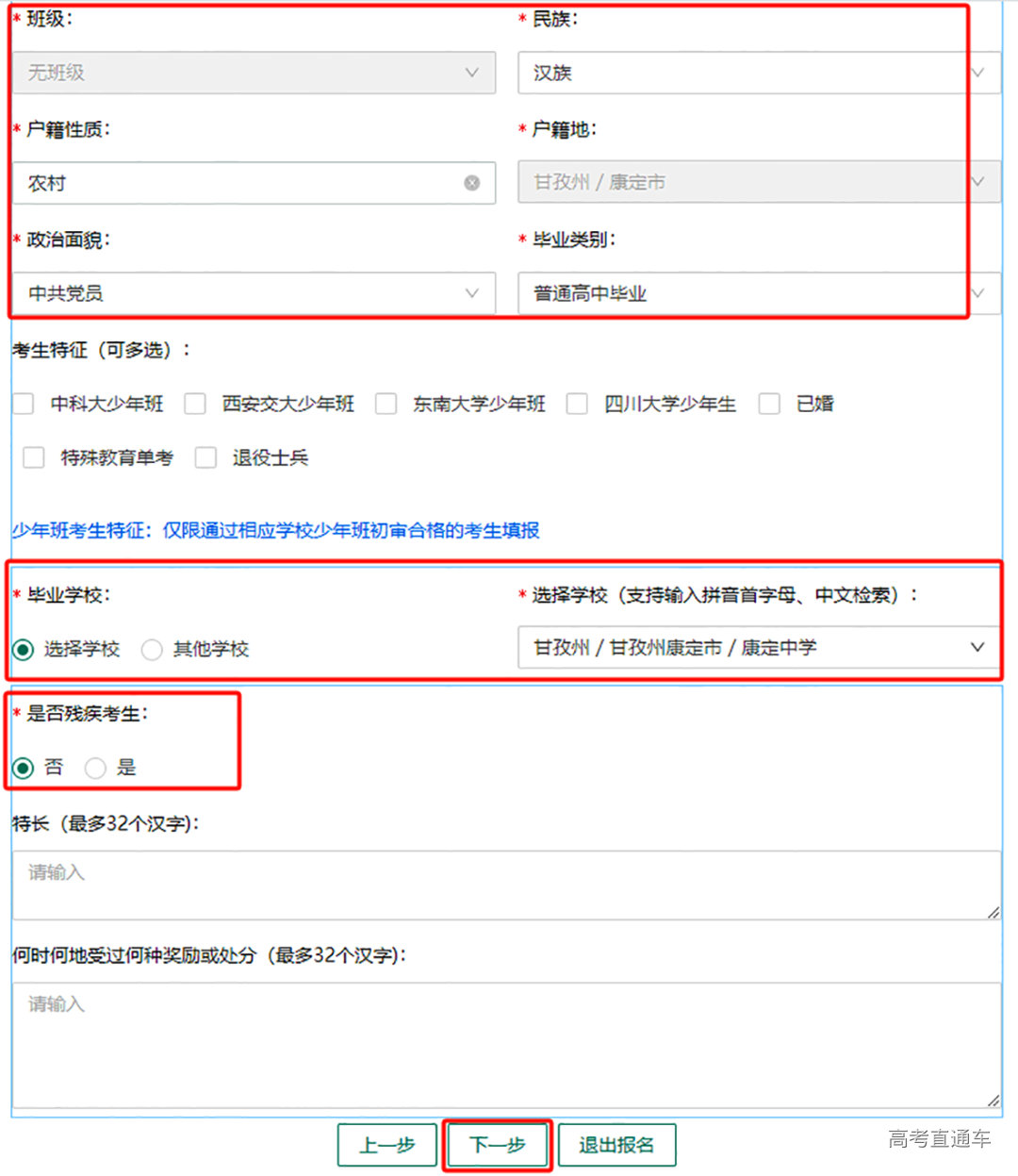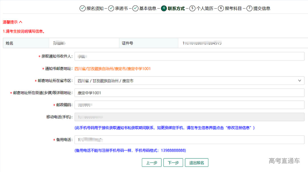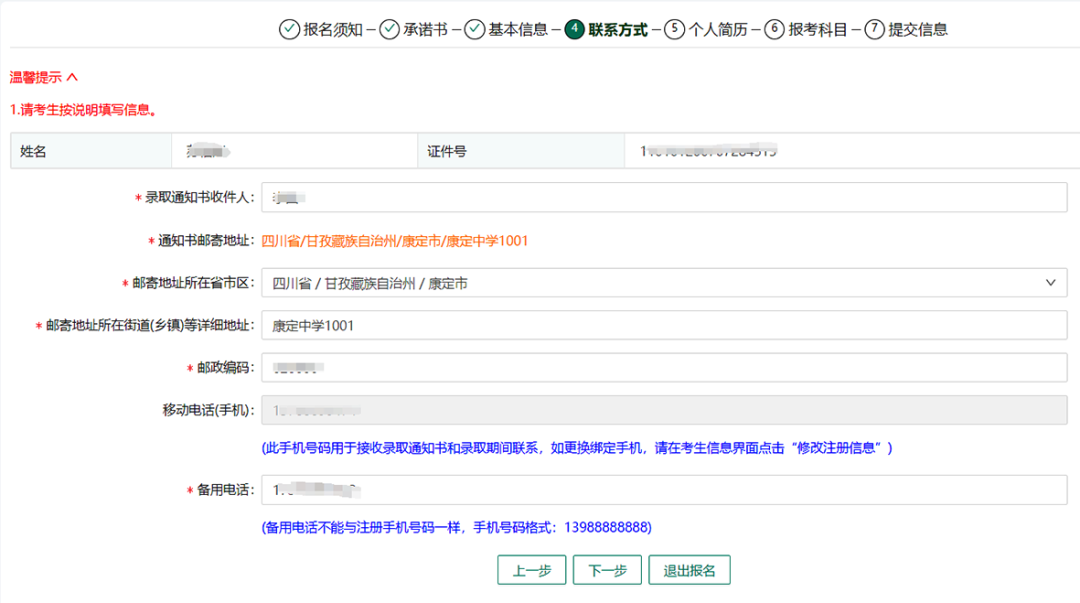 姓名、证件号、区县、报名点等信息已经在系统显示,考生按照报名表要求填写其他信息,包括民族、户籍性质、户籍地、政治面貌、毕业类别、毕业学校、是否残疾考生等。填写完成后点击下一步。