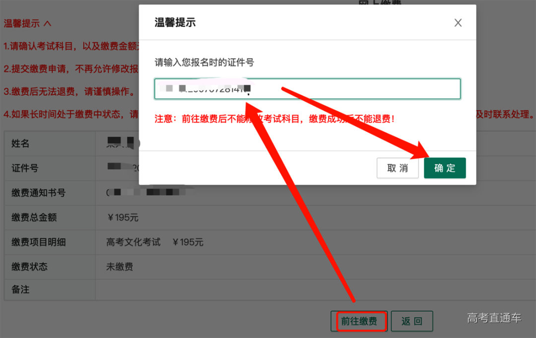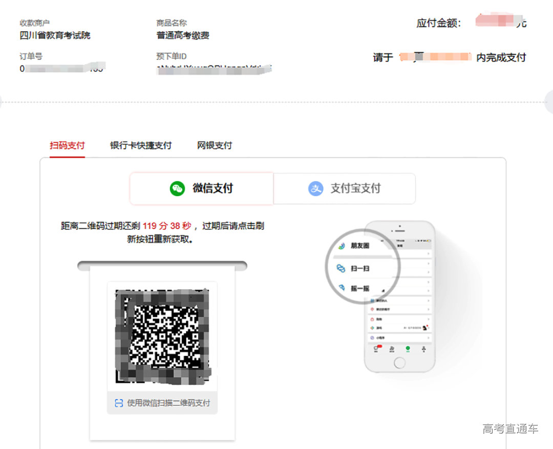 考生核对缴费金额后点击“前往缴费”,输入考生证件号码,页面会跳转缴费支付界面,考生选择合适缴费通道进行缴费。