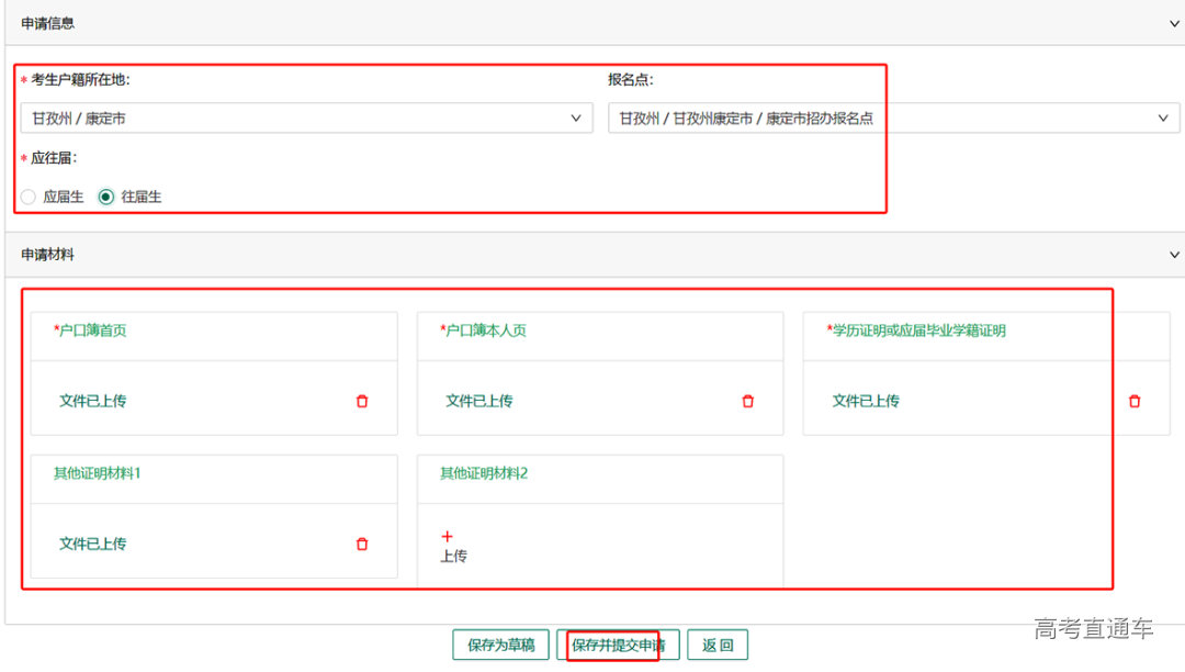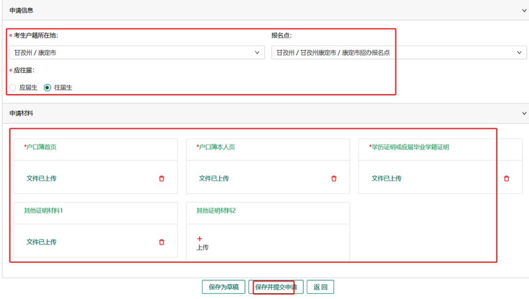 考生根据要求填写申报信息及上传所需材料,点击保存并提交申请即可。
