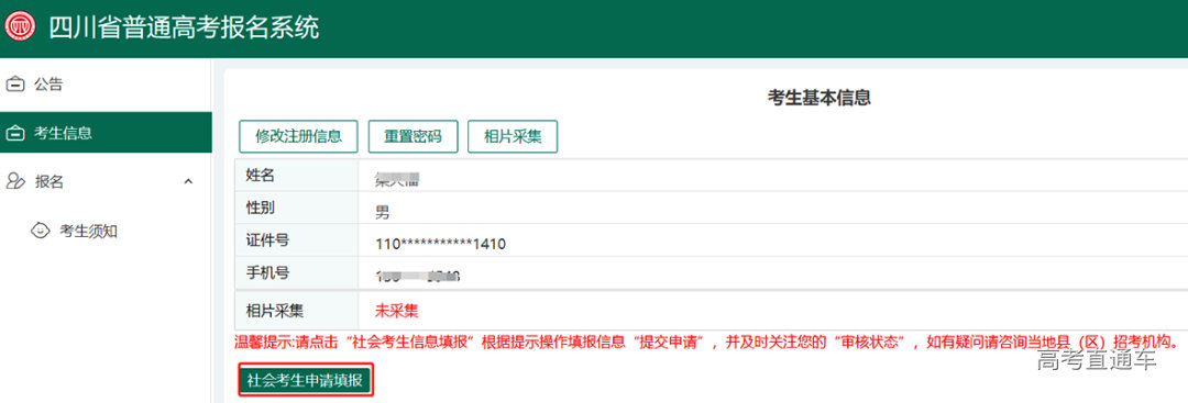 社会考生,指在户籍地外就读回户籍地报名的考生、往届生、同等学力考生、外省回川报名考生等。社会考生须先进行报名资格申报,通过审核后方可进入报名信息填报流程。