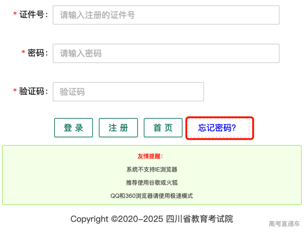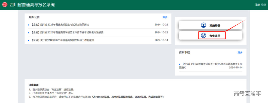 系统网址为https://gkbm.sceea.cn;建议考生使用谷歌浏览器或QQ浏览器、360浏览器极速模式进行报考,系统不支持IE浏览器。