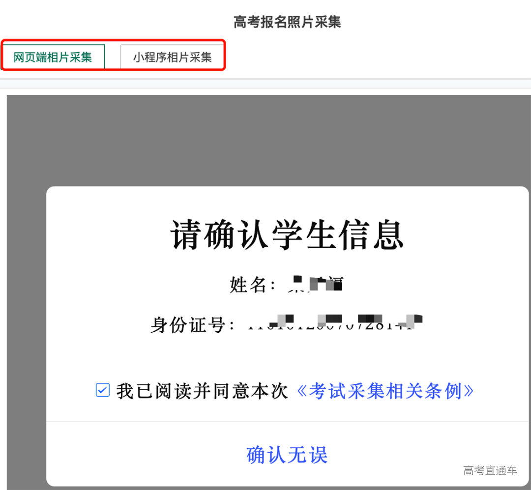 在考生报名信息浏览界面,点“采集相片”,考生可选择:“网页端相片采集”或“小程序相片采集”,并按指引进行线上相片采集。推荐使用微信小程序相片采集功能。