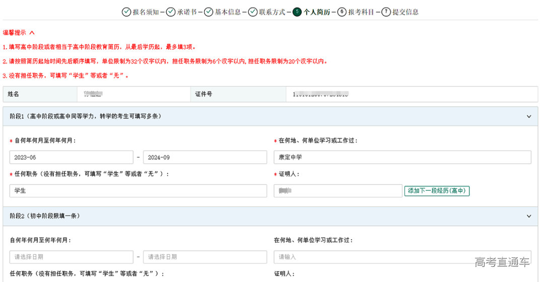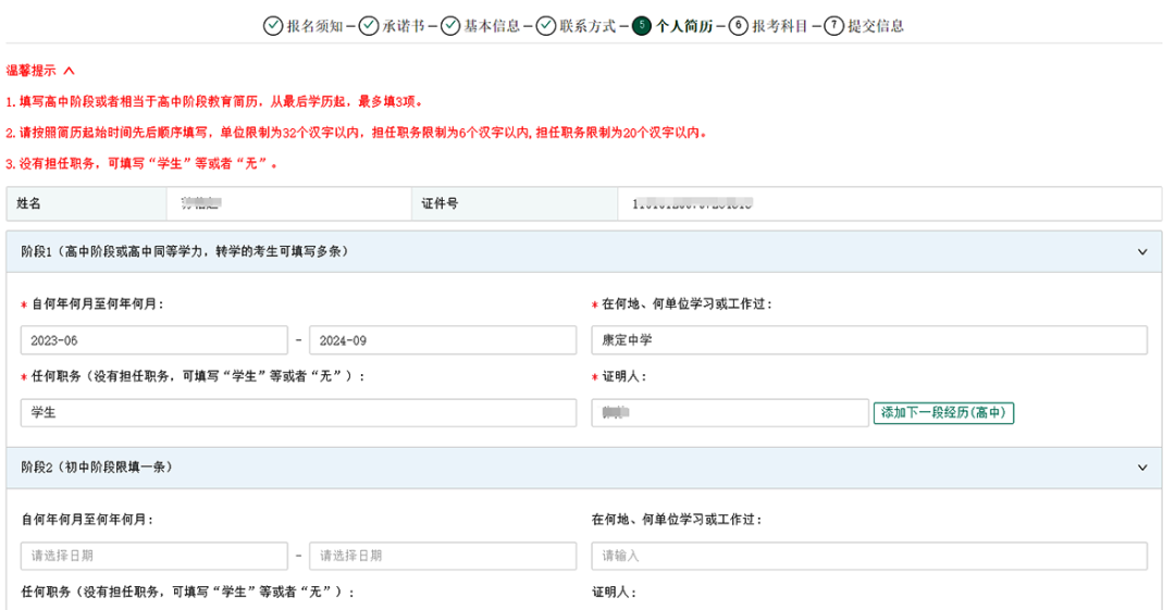 个人简历须填写至少一个阶段的简历,考生如果在高中阶段存在转学等情况,则可点击“添加下一阶段经历(高中)”增加转学阶段的简历,最多可添加2段高中简历。