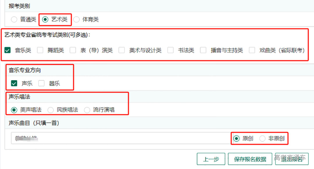 艺术类考生可以根据自己的实际情况,报考类别选择“艺术类”,艺术专业省统考考试类别(可兼报),并根据页面提示完成各类别附加信息的填报,参考界面如下: