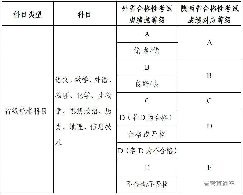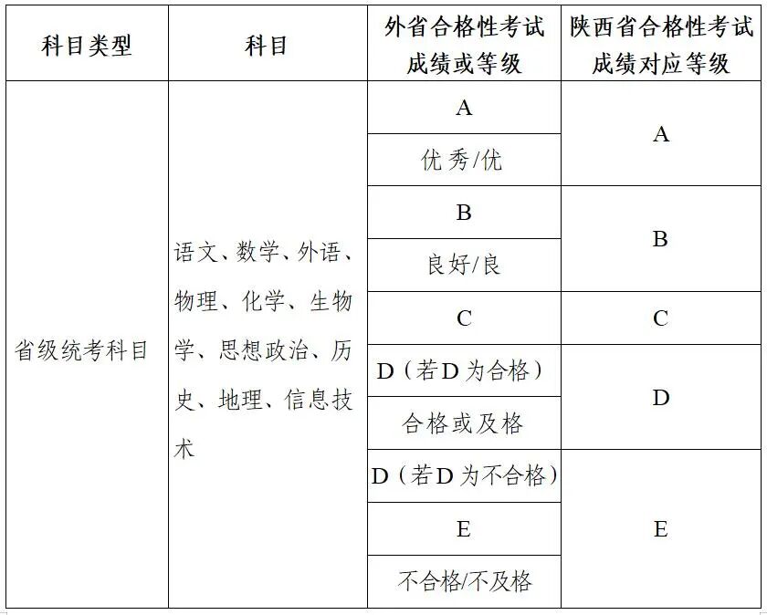 3.成绩转换办法。我省高中学考合格考省级统考科目成绩以A、B、C、D、E五个等级呈现,E等为不合格。外省成绩转换为我省成绩的规则如下: