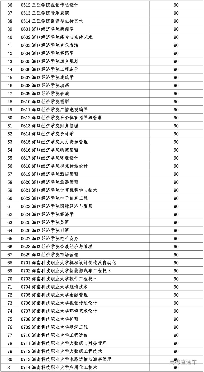2024年海南省普通高等学校专升本录取最低控制分数线为不低于90分,按照招生学校各专业招生计划数1:1比例划定。其中原“建档立卡贫困家庭毕业生”专项计划录取最低控制分数线为划定相应专业录取分数线下20分(详见附件1);“退役大学生士兵”专项计划由招生学校根据职业适应性或职业技能综合考查结果,并结合考生在校期间成绩、服役期间表现等情况综合评价,按照各专业招生计划数1:1的比例择优录取。考生成绩不低于划定报考学校相应专业的最低录取控制分数线,则确认为所报考学校相应专业预录取的考生,考生也可向报考学校查询本人的预录取信息。