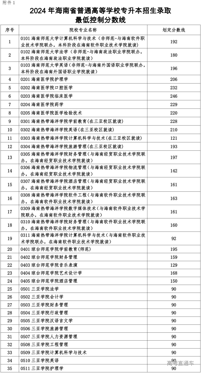 附件:1.2024年海南省普通高等学校专升本招生录取最低控制分数线