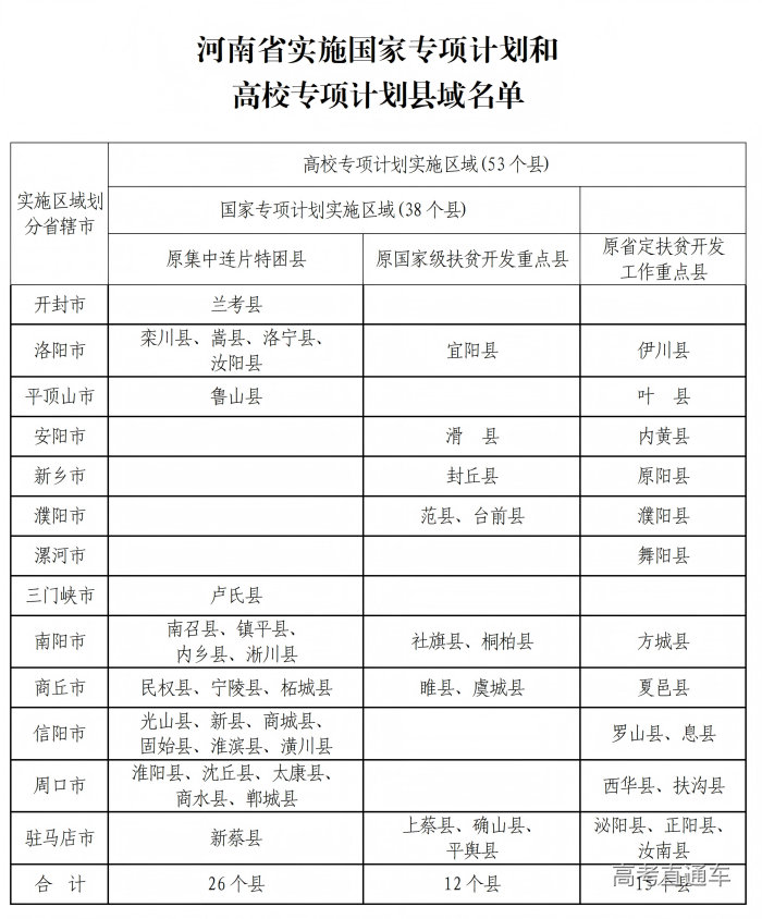 高校专项计划实施区域共53个县(国家专项计划确认的38个县和15个原省定扶贫开发重点县,名单附后)。考生须同时具备下列条件:本人及父亲或母亲或法定监护人户籍地在实施区域的农村,本人具有当地连续3年以上(至今)户籍;本人具有户籍所在县高中连续3年学籍并实际就读;已在当地参加2026年统一高考报名且通过报名资格审核。