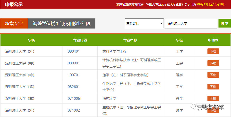 在教育部公示的2023年度普通高等学校本科专业申报材料公示(注:高等学校本科专业设置与服务平台),已经查询到深圳理工大学(筹)首批本科专业公示材料。