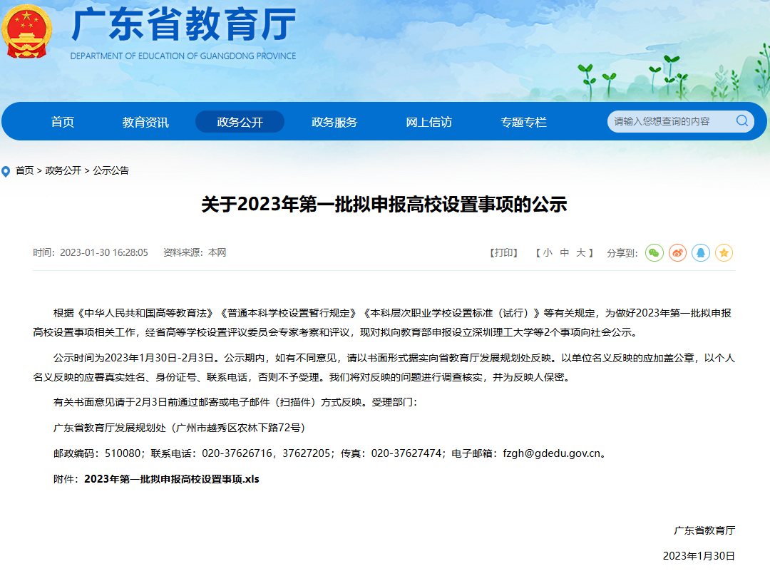 2023年1月,广东省教育厅发布关于2023年第一批拟申报高校设置事项的公示,深圳理工大学拟向教育部申报设立。建校基础新建本科,举办者深圳市人民政府,办学地深圳市,公办普通本科。