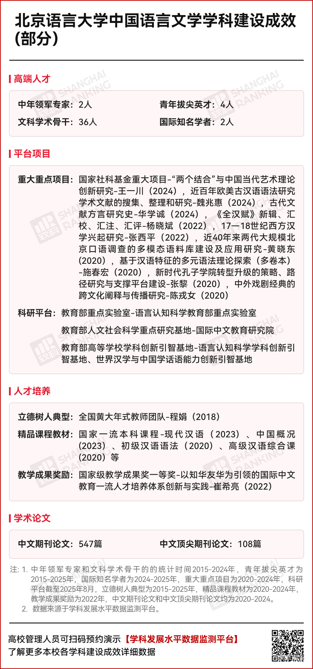 例如在高端人才方面,北京语言大学中文学科师资力量雄厚,拥有众多在我国中文研究领域发挥着领军作用的知名学者,其中文科学术骨干(2015-2024年)高达36人。