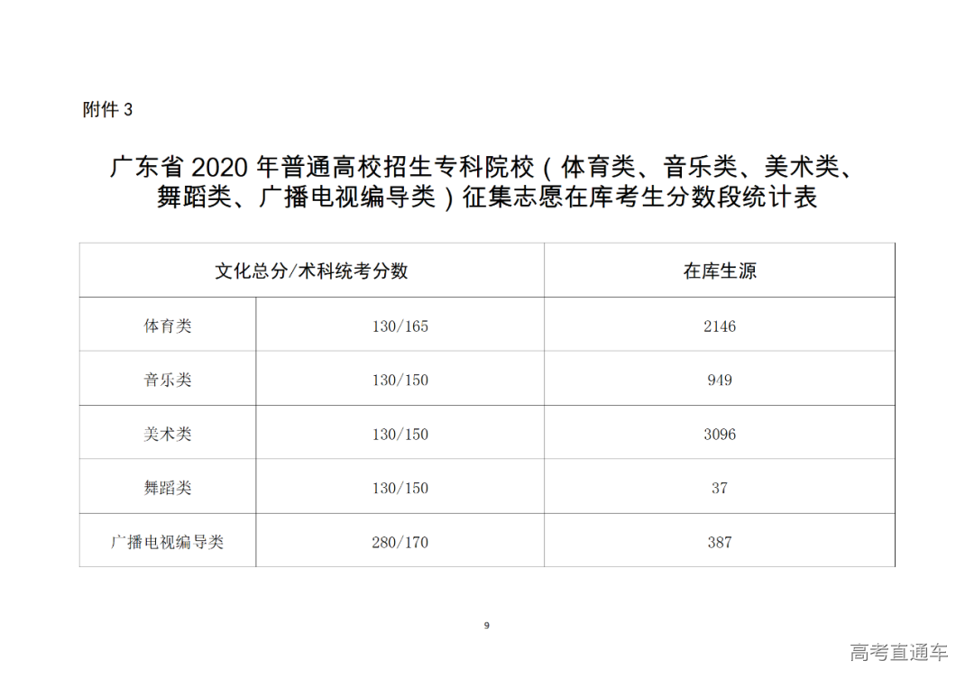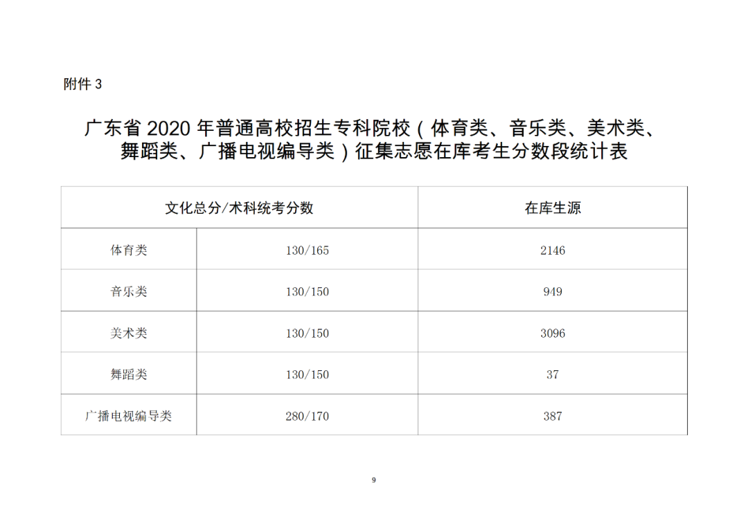 3.广东省2020年普通高校招生专科院校(体育类、音乐类、美术类、舞蹈类、广播电视编导类)征集志愿在库考生分数段统计表