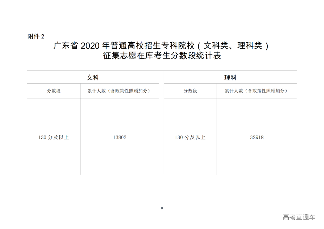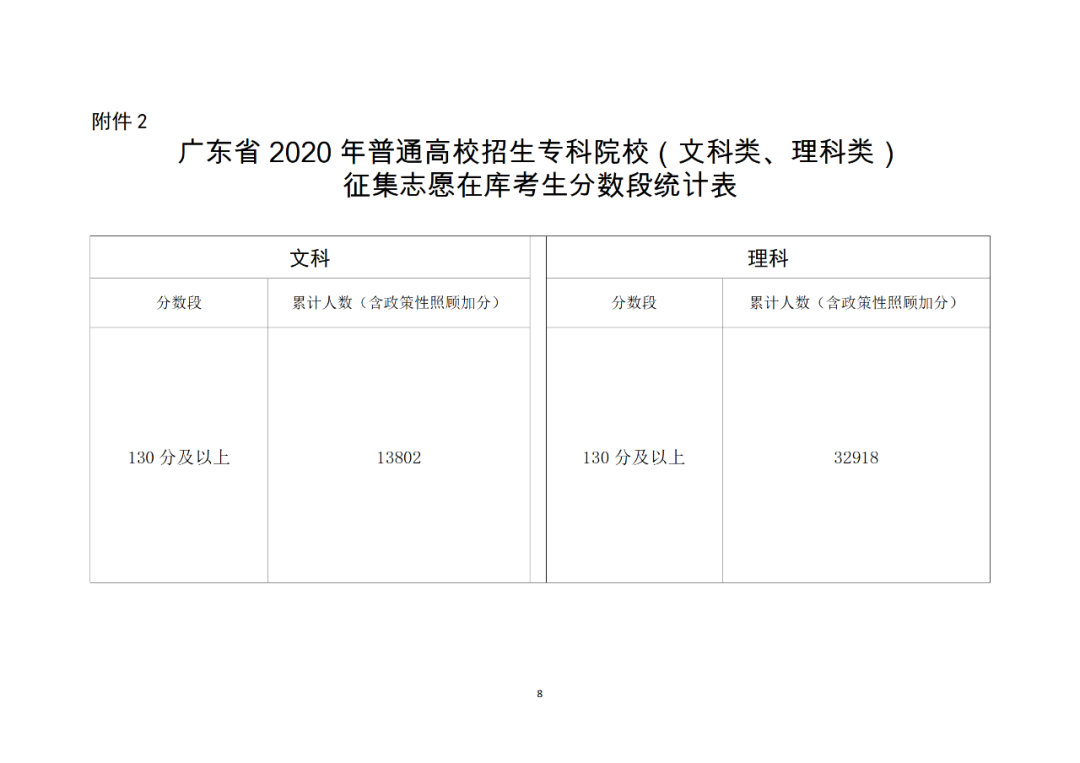 2.广东省2020年普通高校招生专科院校(文科类、理科类)征集志愿在库考生分数段统计表