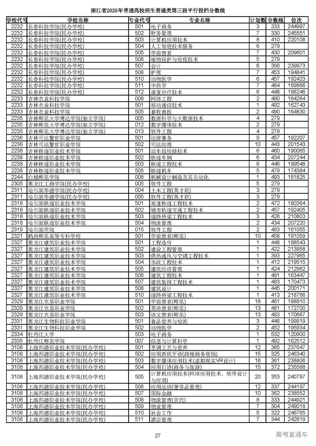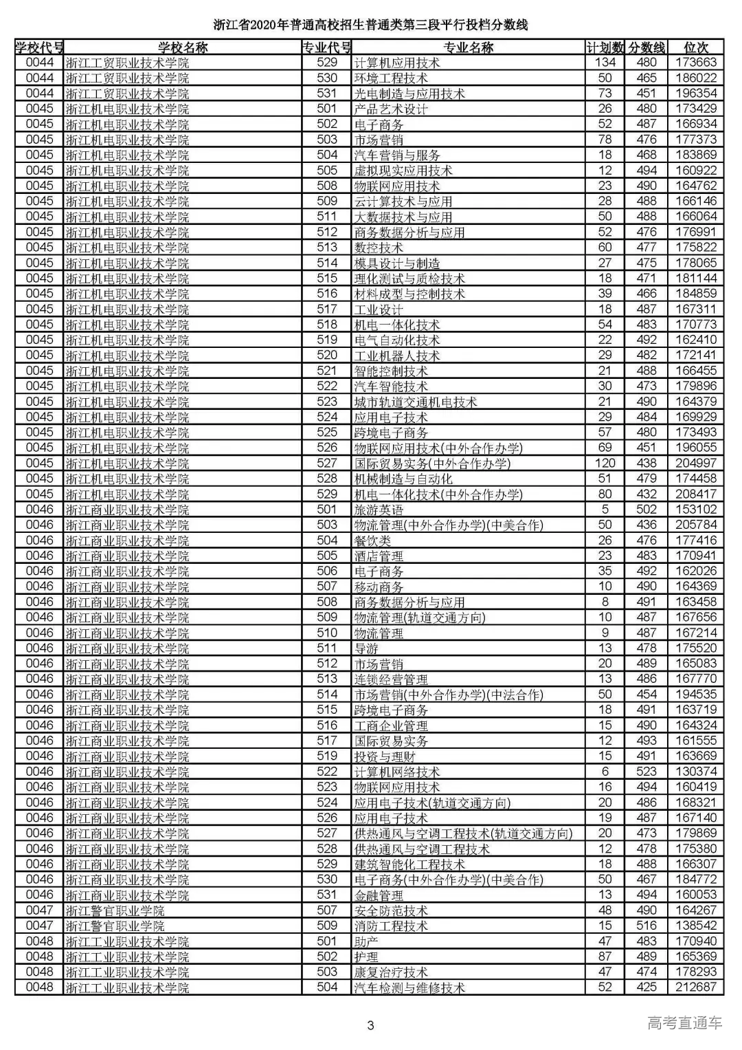 普通类第三段平行投档分数线