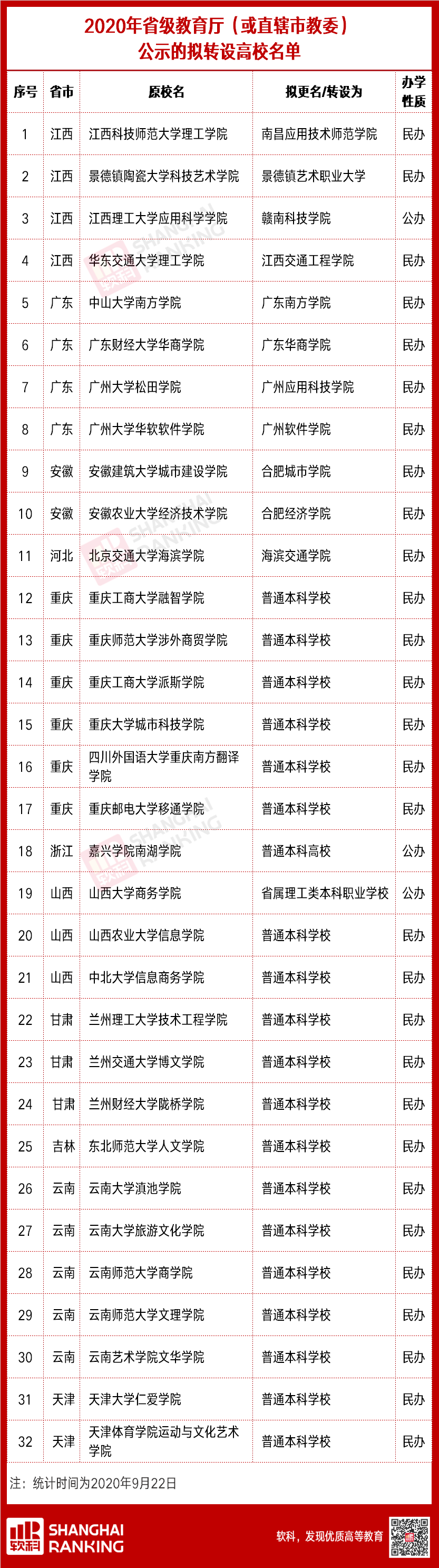 截至目前,获省级教育厅公示转设申请的独立学院至少32所,获教育部公示转设成功的独立学院为14所。(如有遗漏,欢迎留言补充)