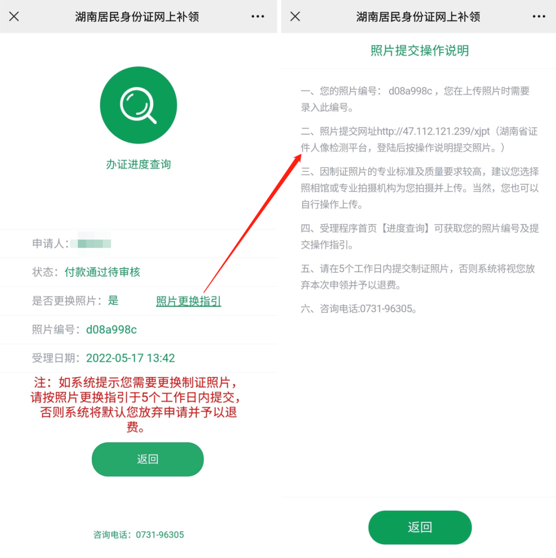 三、符合网上补换领条件的申请人按程序完成缴费后,系统会提示申请人提交近期拍摄且符合制证标准的电子照片(系统未提示上传照片的,将使用历史制证照片)。申请人申领登记完成后,系统将为办证人分配唯一的相片编号,编号可在“进度查询”功能中查看。申请人需要按照相片提交操作说明,登录“湖南省证件人像检测服务平台”,提交符合制证标准的电子照片。(如下图)