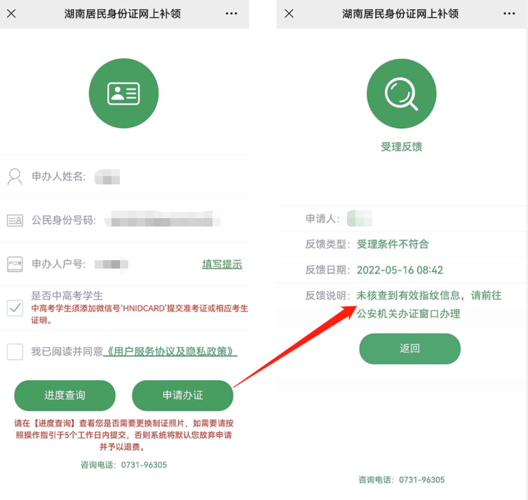 若申请人在我省没有办理过登记指纹的居民身份证,系统会提示申请人前往公安机关窗口办理(如下图)。