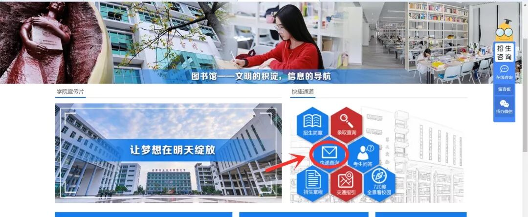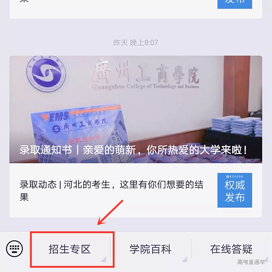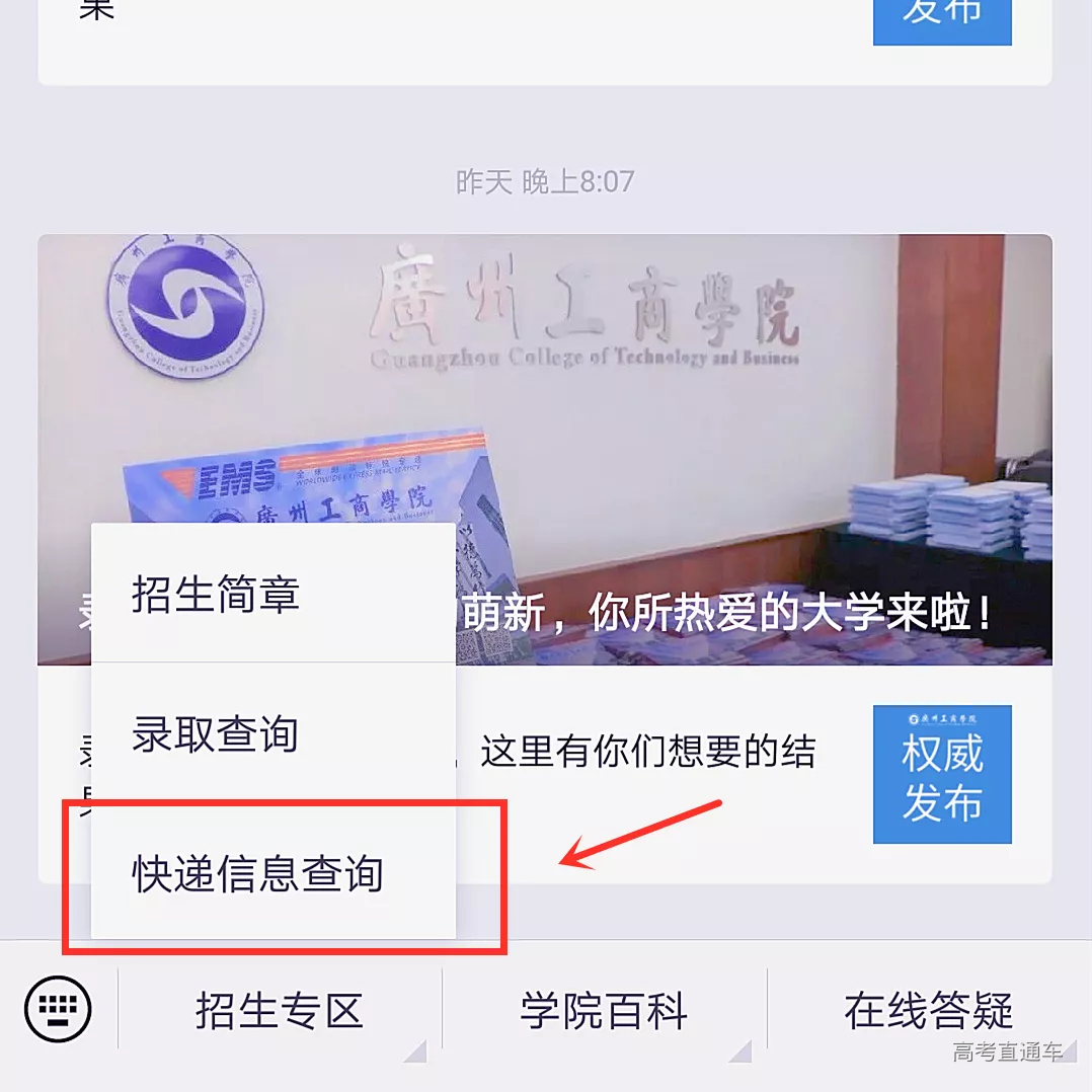 《录取通知书》、《广州工商学院2019级新生缴费须知》、《学生资助政策简介及申请材料说明》、《致高校青年学生的一封公开信》、《校园通信服务指南》等各类宣传单。 一封又一封颜值满分、内涵丰富的录取通知书即将飞向天南海北,送到每一位学子的手中。 一 微信公众号 微信搜索广州工商学院招生办微信公众号 1、点击左下角招生专区 2、点击快递信息查询 3、填写准考证号 二 官网查询 搜索广州工商学院官网 http://www.gzgs.edu.cn/ (长按复制) 1、点击招生就业 2、点击招生信息 3、点击快递查询 4、填写准考证号 风里雨里 宣服君在广工商等你