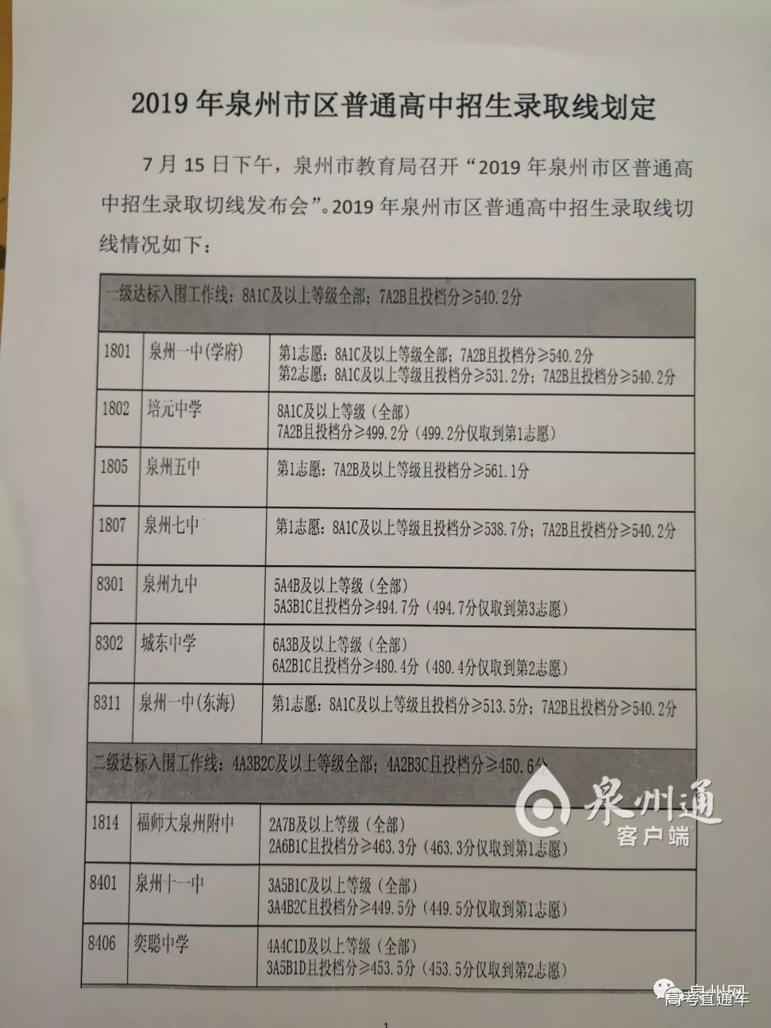 今天下午,泉州市教育局召开了2019年市区普通高中招生录取切线发布会,确定了泉州一中、培元中学、泉州五中、泉州七中、城东中学、泉州九中等学校的录取等级及最低分数线。