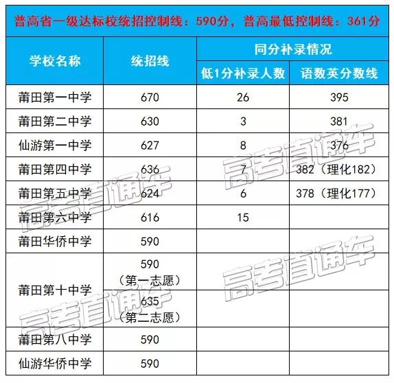 莆田市2019年中考省一级达标校录取控制线划定:省一级达标校投档录取控制线590分,普通高中最低录取控制线361分。