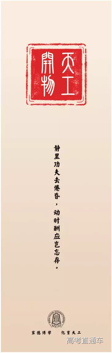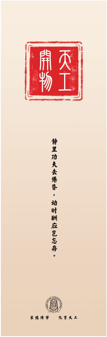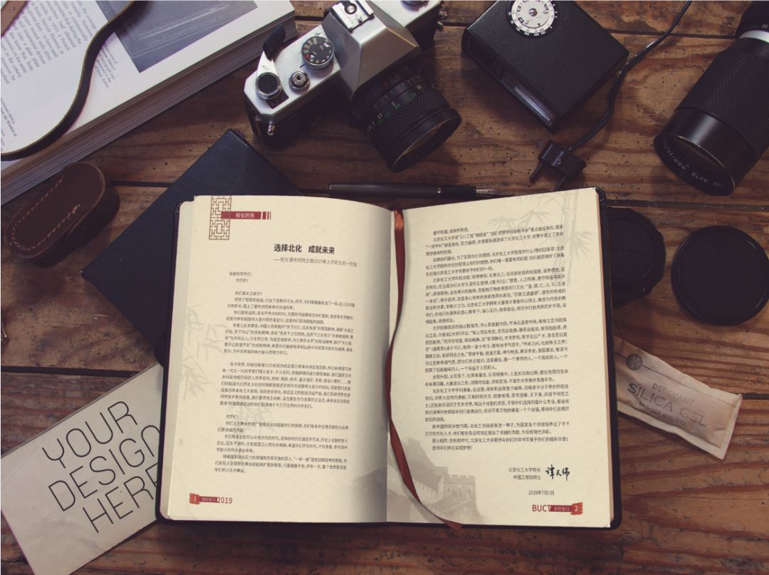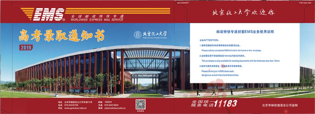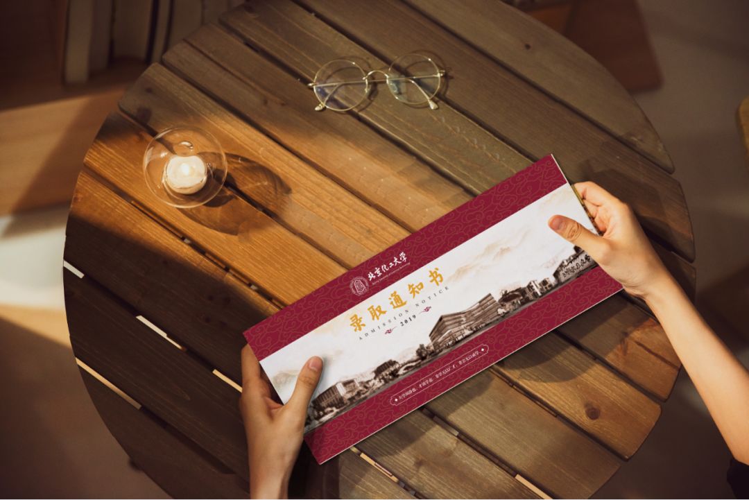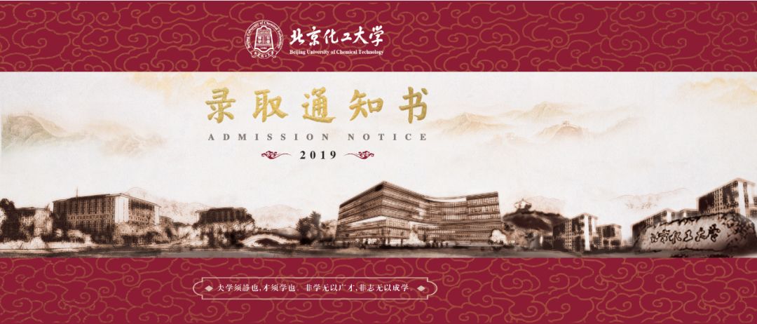 北京化工大学2019版高考录取通知书文化形象设计,以高考录取通知书为核心,形成一个既具备高考录取功能又具有学校文化传播意义的文化设计体系。2019版高考录取通知书的封面设计,由纹饰、图画和文字组成,采用留上下幅边、左右贯通形式的横版构图方式,形成一幅写意壮阔的山水画卷。画卷主体元素为北京化工大学标志性建筑群,“2019”,与北化四年携手,“爱你永久”,与北化情系一生。 录取通知书的上下幅边缀以“祥云”纹饰,寓意吉庆、祥和,表达对北化学子的庆贺与祝福。学校楼群嵌于云间,“好风凭借力,送我上青云”,表达学校努力为北化学子搭建梦想舞台,成就学子美好未来,终会长风破浪,青云直上。同时,也希望北化学子不坠青云之志,胸怀理想,志存高远;不忘求学初心,宏德博学,化育天工。“祥云”纹饰采用绛红色底衬,既蕴含了学校的办学初衷——办社会主义中国大学,办祖国和人民的教育,对祖国和人民的教育事业赤诚忠贞;又传承中华人民共和国成立70周年的红色文化基因,努力培养又红又专、德才兼备、全面发展的中国特色社会主义合格建设者和可靠接班人。 主画面采用经过水墨风格处理的学校标志性建筑群形象和远处隐约可见万里长城的巍峨高山作为背景图形,既含地处首都的北化欢迎你之意,也形成山水延绵、气韵流淌的大气水墨的表现意境。远眺群山,长城盘亘,胸怀开阔;近观流水,亭台楼阁,赏心悦目。闲坐庭前,花开花落,宠辱不惊;遥望天端,云卷云舒,去留无意。山水相映,花鸟成趣,彰显校园环境之清幽。教学楼里,窗明几净,济济一堂;图书馆内,灯火通明,孜孜不倦。实验室中,格物致知,久久为功;运动场上,摩拳擦掌,跃跃欲试。奋勇争先,团结协作,营造学习风气之优良。画卷构图错落有致,前后有别,远近结合,虚实相生,既宏伟壮观,又细腻动人,既立足当下,又着眼未来,展现了学校良好的风貌和无限的潜能。山水画卷的主色呈淡灰浅黄,相得益彰,既显示学校沉稳厚重、踏实内敛的朴实作风,又展现学校注重创新、引领前沿的奋斗精神,表现着北化人团结奋进、务实力行、争创一流、铸就辉煌。 录取通知书前景使用烫金颜楷字体书写的“录取通知书”中、英文字样和“2019”如意装饰纹样的组合,开门见山,活泼鲜明。前景背景相得益彰、气韵流淌方正雄浑。上幅边处加有北京化工大学校徽,下幅边采用《诫子书》中的名句“学须静也,才须学也,非学无以广才,非志无以成学”,鼓励同学们戒骄戒躁,立定鸿鹄高远之志,做一个博学、高尚和有益于人民的人。 录取通知书背面采用金黄色主色,正文部分是录取信息,背景辅以“独占鳌头”纹样,恭贺各位同学金榜题名。录取通知书信封设计采用传统与现代相结合的“书信”形式,文字内容包括校徽、校训、年份标记以及“BUCT”创意图章。信封以绛红色为主色,与淡黄色搭配,传达出喜庆、雅淡、祥和之意境。 2019版高考录取通知书整体设计风格既墨色清新、又沉稳豪迈,既大气磅礴、又细腻灵动,衬托出北京化工大学经历60年发展秉持的博学创新、赞天地之化育的办学育人宗旨和风雨兼程、蓄势勃发、砥砺奋进、继往开来的奋斗精神。 ----邮寄清单---- 北化特色EMS邮封中包含: 1. 录取通知书 2. 录取通知书信封 3. 录取指归,高考录取指归包括“高考录取书笺”、“高考录取指南”和“高考录取留念”三部分内容。其内附 (1)纪念书签 (2)纪念明信片 4. 银行卡 5. 行李标签 X 2 6. 北京化工大学学生资助服务手册 (1)北京化工大学学生家庭经济情况调查表 (2)国家助学贷款父母确认书 7. 大学生参军入伍宣传册 8. 高等学校学生资助政策简介 录取通知书 北化特色EMS邮封 指归即主旨和意向,意为将这部《高考录取指归》作为架起学生与大学之间的“虹桥”,引导学生走进大学,开始大学人生。2019版高考录取指归,采用深红色封面封底设计,封面《劝学》中广为流传的诗句作为背景,衬托金色“2019”、“入学指归”等字样和北京化工大学logo,突出我校学子勤勉好学的形象。 (一)高考录取书笺 校长的一封信 “高考录取书笺”包括两部分内容。其一,校长的信。此为北京化工大学校长谭天伟院士写给2019级入学新生的一封信。谭校长鼓励莘莘学子胸怀“天下兴亡,匹夫有责”的爱国精神,遵循“大道之行也,天下为公”的无私精神,崇尚“先天下之忧而忧,后天下之乐而乐”的奉献精神,秉承“为天地立心,为生民立命,为往圣继绝学,为万世开太平”的担当精神,践行“天行健,君子以自强不息”的进取精神。希望你们能够继承和弘扬中华优秀传统文化精神,奋发有为,为中华民族的伟大复兴而努力学习。其二,谭校长推荐书目。此为谭校长向新生推荐百部世界经典名著阅读书目。 (二)高考录取指南 “高考录取指南”对学生入学事项做出详尽介绍。 (三)高考录取留念 “高考录取留念”包括两部分内容。 其一,留念书签。2019版留念书签主题由5位中国古代著名科学家组成。五位科学家按历史排序分别为:张衡、祖冲之、毕昇、李时珍、宋应星。鼓励同学们崇尚科学,勇于创新。 纪念书签 其二,留念明信片。2019版留念明信片由代表大一至大四的四张明信片组成。每张明信片由“B”、“U”、“C”、“T”(我校英文缩写形式)、校徽和寄语组合组成,表达了学校对莘莘学子的殷切希望。 除了上述的这些物