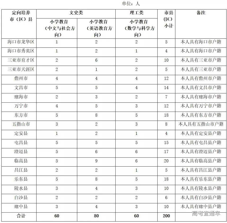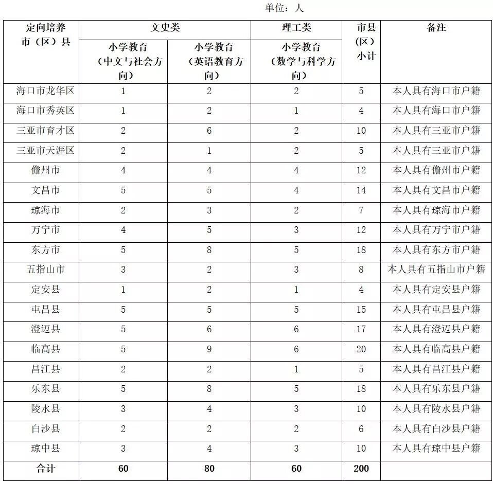 2019年全省定向公培生招生计划为200人,本科层次,学制四年,培养院校为海南师范大学,各市县定向公培生招生指标分配及专业详见附件。