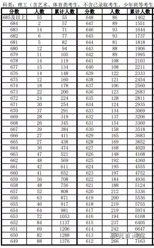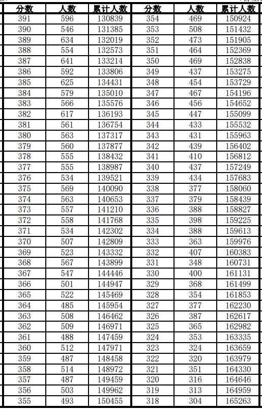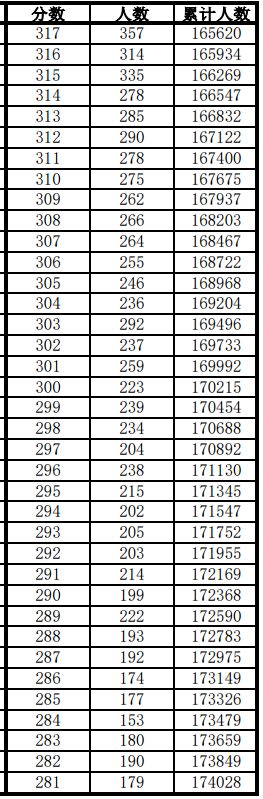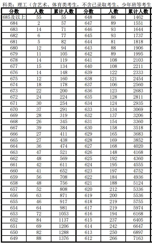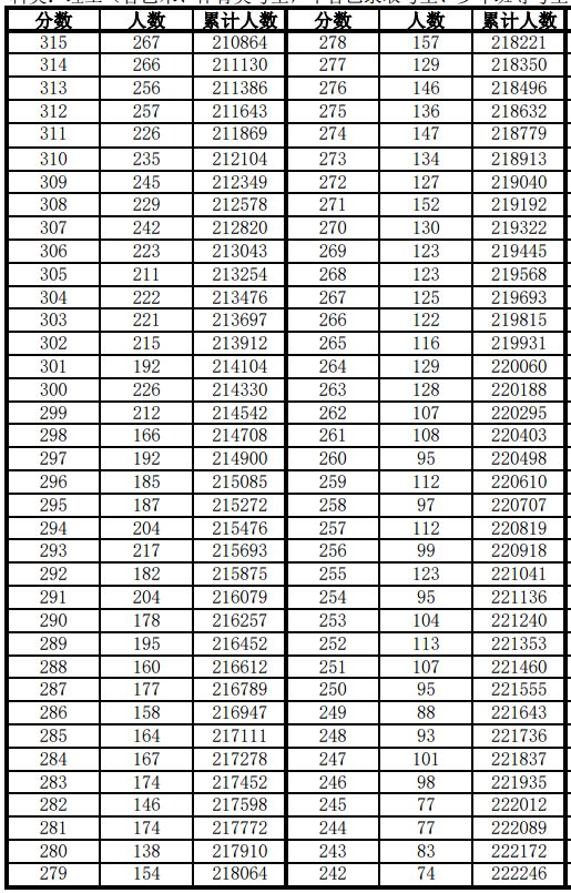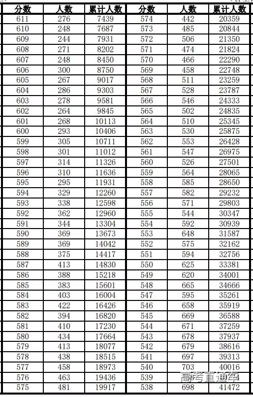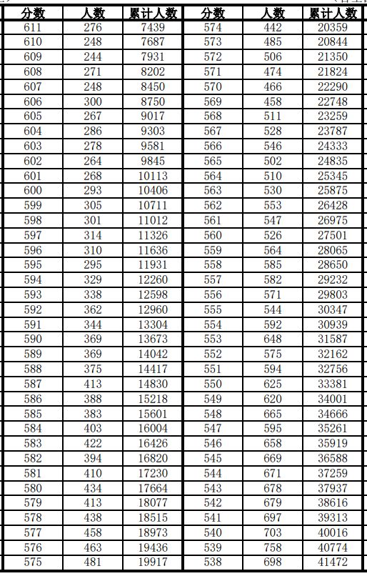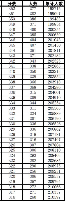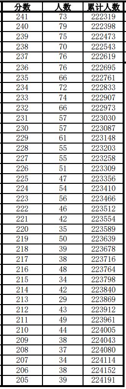它显示每一个分数全省考生有多少名,能让你计算出自己的排位。目前的段表,是将全省同科类考生的档案分(考生总分+政策加分)从高到低排列(分数相同的则为并列),再按每1分一段,统计“本段人数”;从本段向上一直到最高分段的所有“本段人数”相加,则为“累计人数”。一分一段表上显示出每一个分数全省的考生有多少名,这个数据的参考价值最大。