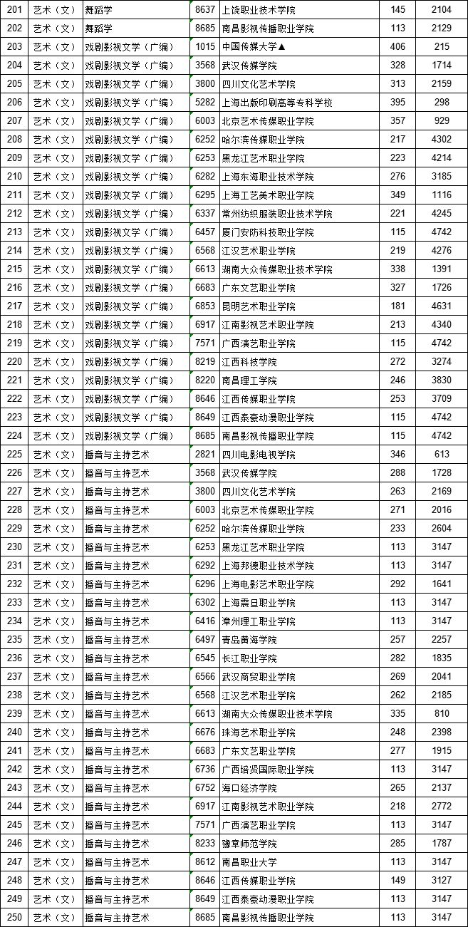 本批次艺术类投档规则为:对达到省艺术类专业统考成绩高职(专科)专业合格线和艺术类专科文化控制分数线的考生,不分文理,依据文化成绩,从高分到低分按志愿进行平行投档。