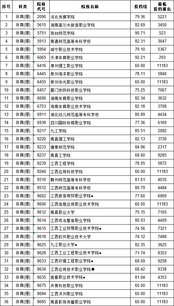 参加本批次体育类专业录取的院校共有36所,平行志愿投档满额院校有29所。投档规则为:对达到省体育类专业统考高职(专科)专业合格线和体育类专科文化控制分数线的考生,依据专业成绩从高分到低分按志愿进行平行投档。投档分数靠前的院校分别是: