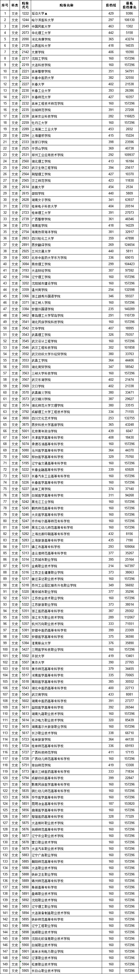 参加本批次录取的文史类院校共有742所,平行志愿投档满额院校有394所。投档分数居前的院校是: