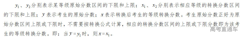 先按原始分数划定等级,再进行等级赋分。按照每门科目考生的原始分数从高到低划定为A、B、C、D、E五个等级,各等级人数所占比例分别为15%、35%、35%、13%和2%,将考生的原始分数转换成等级。转换基数为实际参加该科目考试并取得有效成绩的人数。成绩转换时以30分作为赋分起点,满分为100分。将A至E五个等级内的考生原始分数,依照等比例转换方法,分别对应转换到100~86、85~71、70~56、55~41和40~30五个分数区间,得到考生的等级转换分数。等级转换分数计算结果按“四舍五入”进行处理,以整数呈现。等级转换分数一分一档,与原始分数排序保持不变。