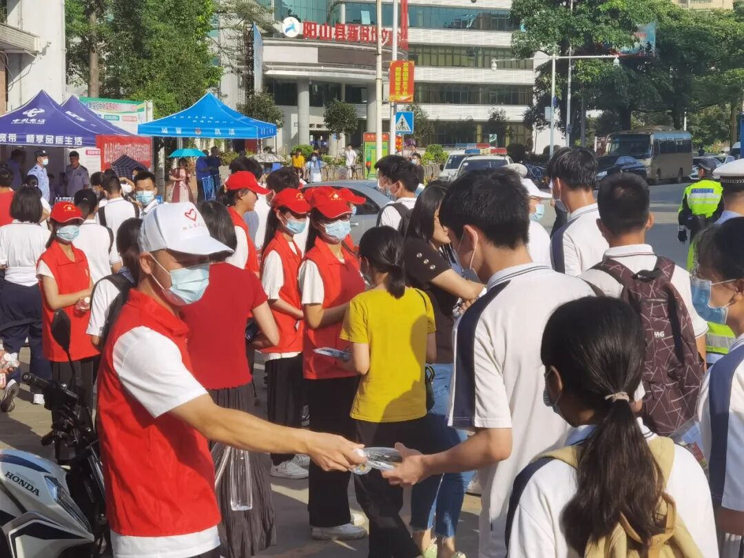 ▲阳山1702名学子精神奕奕走进考场,爱心同行车队和兄弟车友会共85台爱心送考车为接送考生,志愿者们为考生送上饮用水、牛奶第爱心早餐,祝愿考生考试顺利。